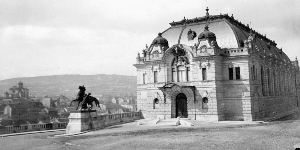 A Lovarda egykor, előtte a Lovat fékező csikós szobra (Vastagh György alkotása, ma az eredeti helyétől egy szinttel feljebb, a Hunyadi-udvaron áll)