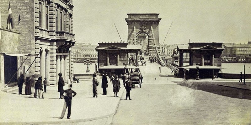 A Lánchíd 1898-ban a mai Széchenyi térről nézve. Az előtérben a vámszedőházak, háttérben a királyi palota, még az átépítés előtt.