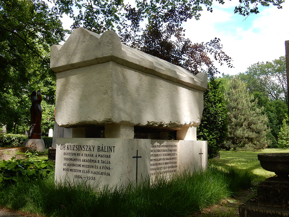 A sírkert legöregebb síremléke stílszerűen egy régész, Kuzsinszky Bálint nyughelye fölött található, az ő nevéhez fűződik Aquincum feltárása, és ő volt a Fővárosi Múzeum első igazgatója is. Az 1938-ban elhunyt tudós – Karinthy Frigyes és a Faludy György nyughelyével szomszédos – sírját azóta egy eredeti, római kori szarkofág díszíti, amely a temető legrégebbi köve.