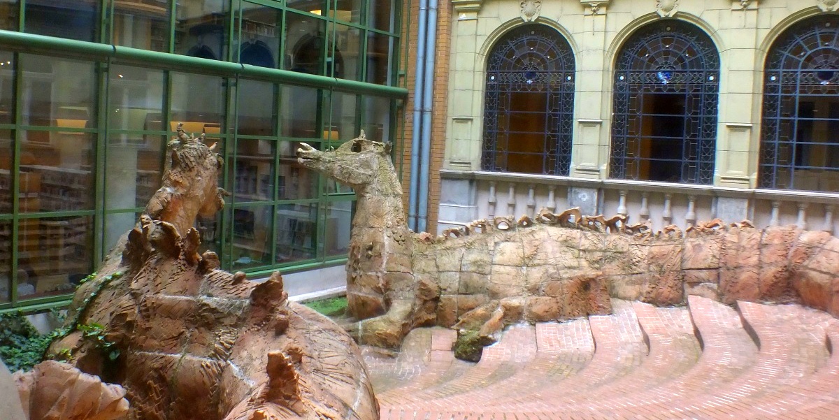 A Fővárosi Szabó Ervin Könyvtár gyerekkönyvtárának igazi sztárjai a sárkányok, akik a 2001-es felújítás óta őrzik az intézmény belső udvarát. (Az üvegfalon keresztül az emeleti olvasótermekből is láthatók, de a felnőtteknek hátat fordítanak.) Maguk a szobrok, Pusztai Ágoston alkotásai 1999-ben készültek. Békés természetűek, jó időben még melléjük (sőt rájuk?) is lehet telepedni.