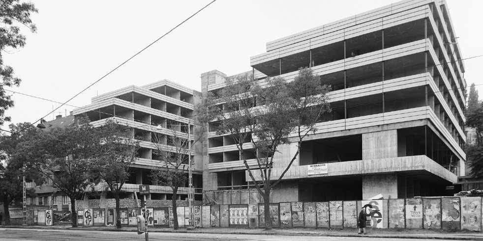 Aki az utóbbi években a Bécsi úton járt, bizonyára észrevette a 104-es szám alatti hatalmas (több mint 8000 négyzetméteres), hétemeletes épületet, amely ijesztő torzóként, valódi szellemházként meredezett a járókelők feje fölé. Falán sokáig tábla is hirdette: vakolatomlás, parkolás csak saját felelősségre.