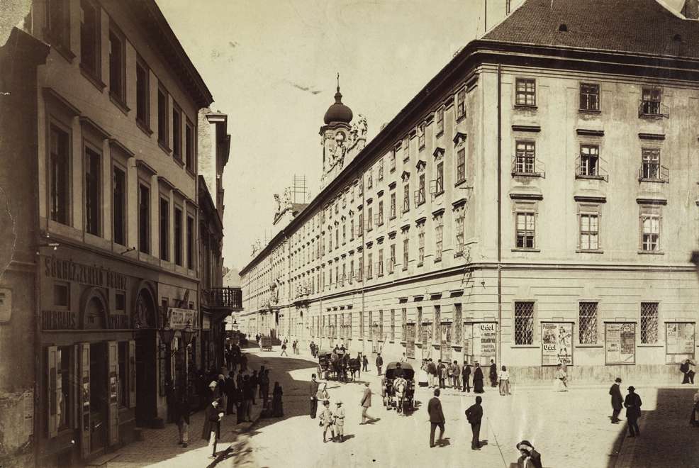 Városház (Gránátos) utca, jobbra a Gerlóczy (Rostély) utca. Szemben a Károly-kaszárnya (előtte az Invalidus-ház, ma Városháza). A felvétel 1894 körül készült (Forrás: Fortepan/Budapest Főváros Levéltára)