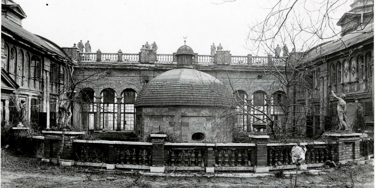 Wagner már kissé romos villája 1942-ben. A türbén még a jezsuita kápolnává alakítás egykori nyomai: az ovális ablakok és a laterna a kupolán – de a tetején már félhold jelzi az iszlám akkori legészakibb szent helyét (Forrás: FSZEK Budapest-képarchívum)