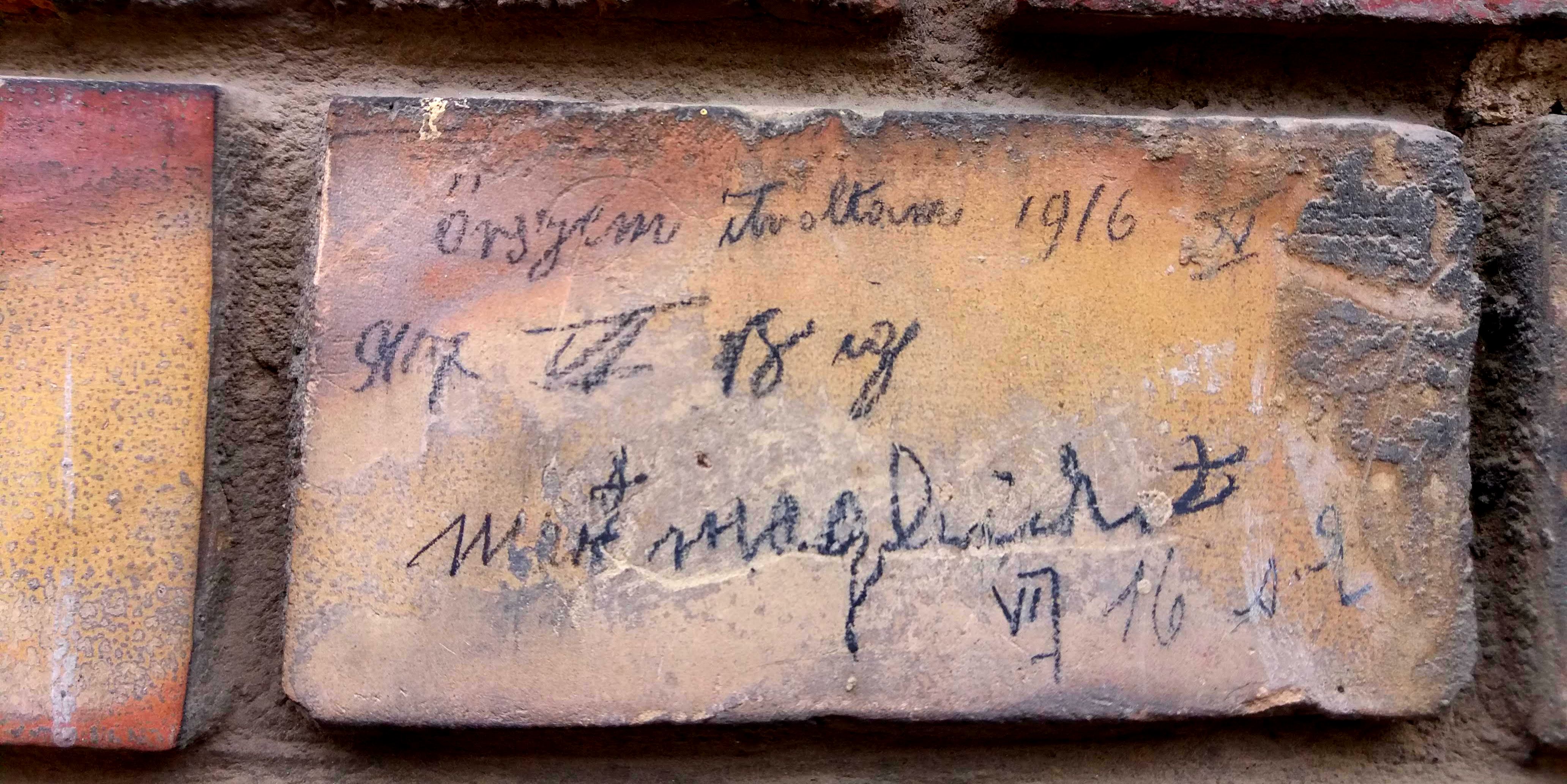 Száz meg száz felirat fut így végig az ódon épületek aljában, szemmagasság körül. Köztük jócskán százévesek is, sőt megtaláltuk a feltehetően legrégebbi, 1898-as feliratot is. Biztosan több is volt belőlük, de mára azok őrződtek meg, amelyek az épületeken körbefutó kis párkány vagy más kiugró elemek (pl. erkély) alá kerültek.