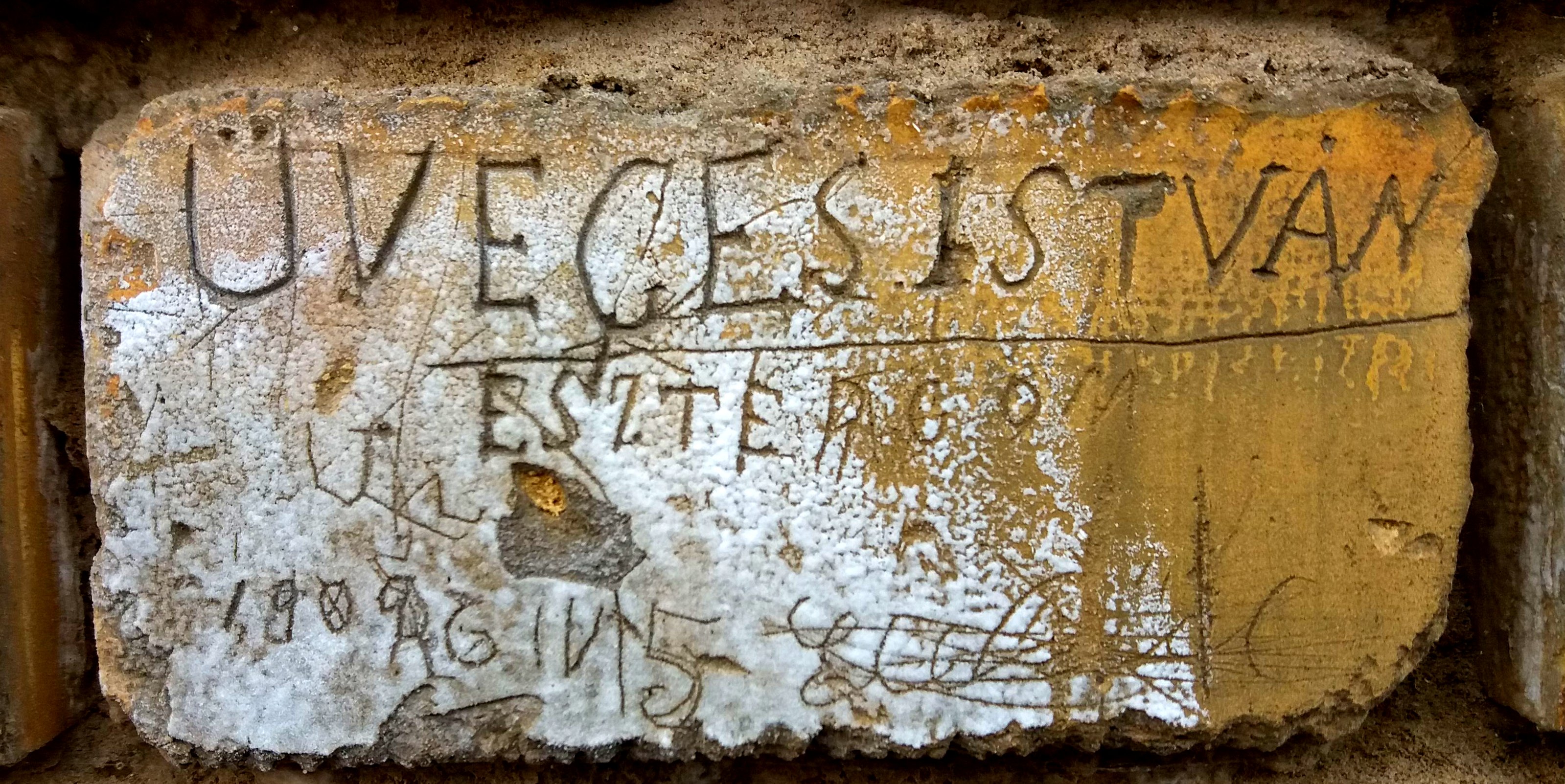 Freskóba vésett nevek egy veronai templomban 1390-ből: középkori szokás lehetett (Fotó: Viczián Zsófia/pestbuda.hu)