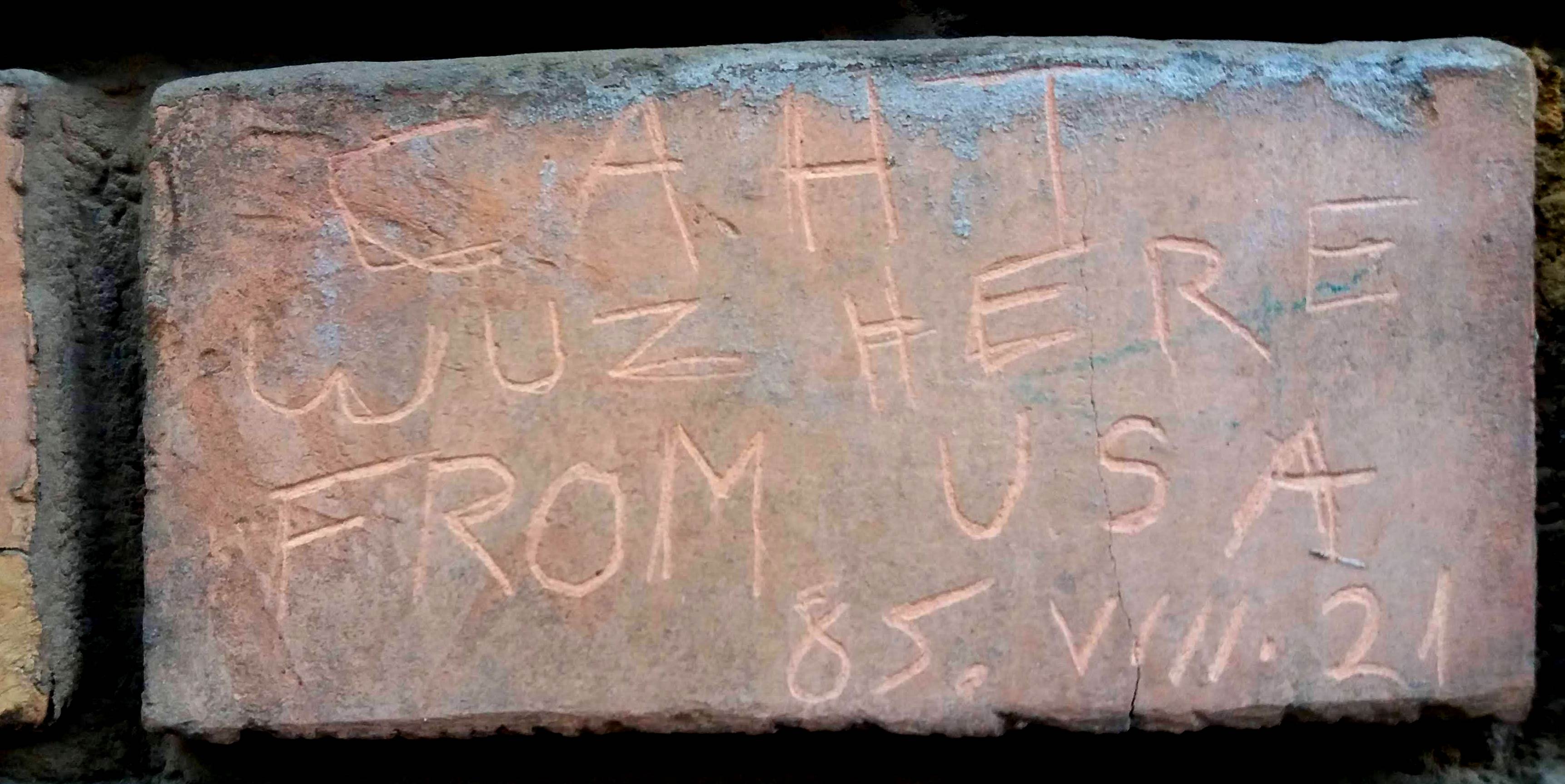 Megannyi kézírás fut végig a pavilonok, sőt a kápolna falán is. Sokféle betű, kézjegy, hol kaligrafikusan szépek, hol egészen egyszerű ákombákomok. Egy-két idegen nyelvű felirat is van. 1898 és 2018 közt mindenféle időszakból – bár úgy tűnik, a szokás inkább a korai évtizedeket jellemezte.