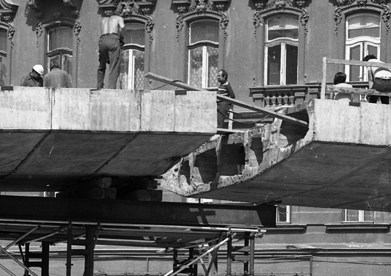 A felüljáró építése a Nyugati (Marx) téren 1981-ben, a felvétel a részleges visszabontáskor készült (Forrás: Fortepan)