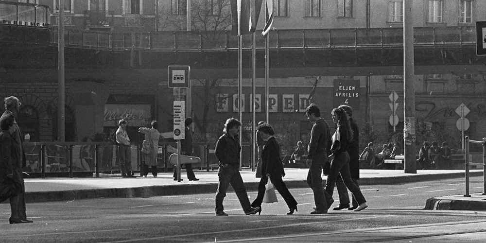 Szabálytalan gyalogosok 1984-ben. Nem mentek le az aluljáróba, pedig ott lenne a helyük (Forrás: Fortepan)