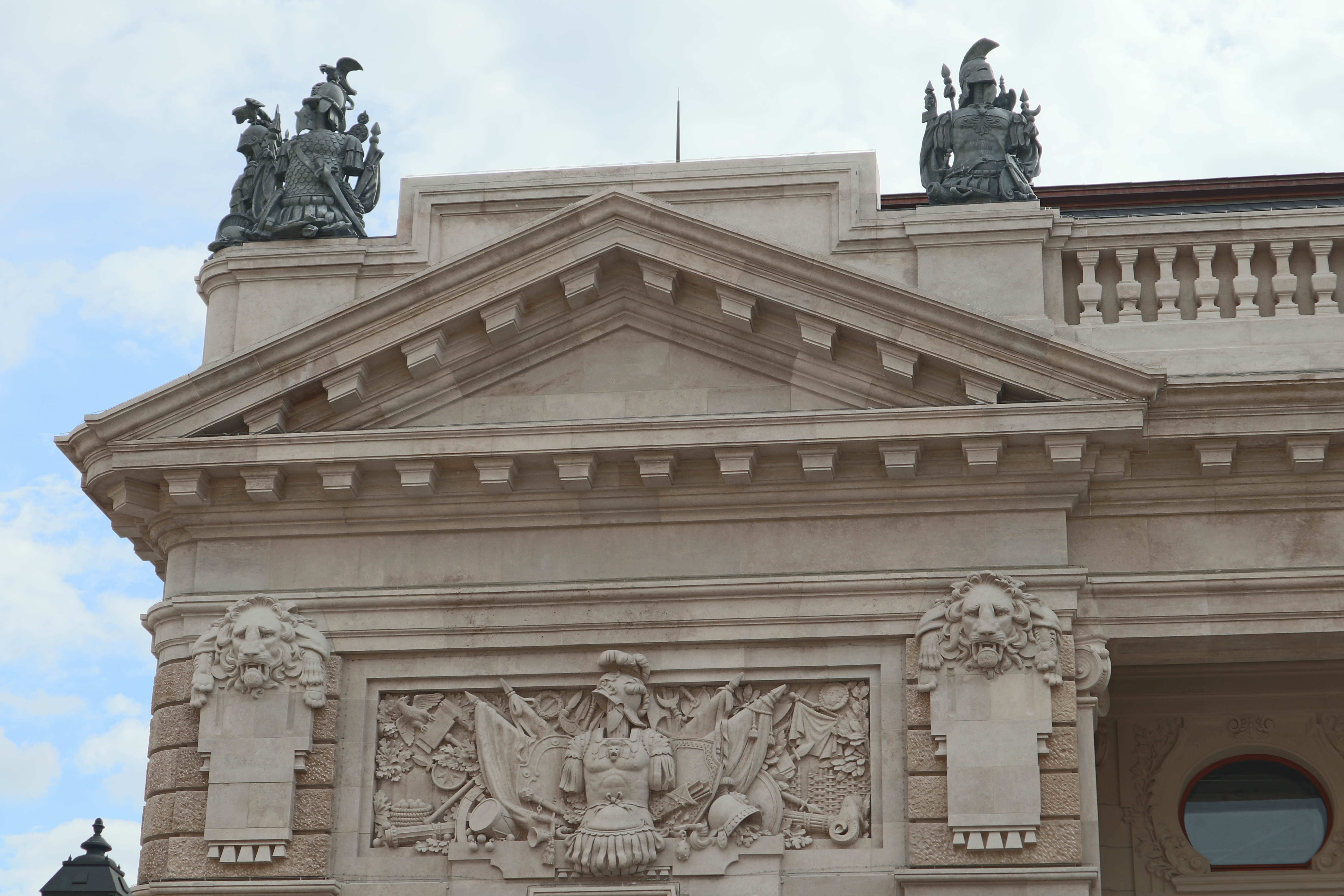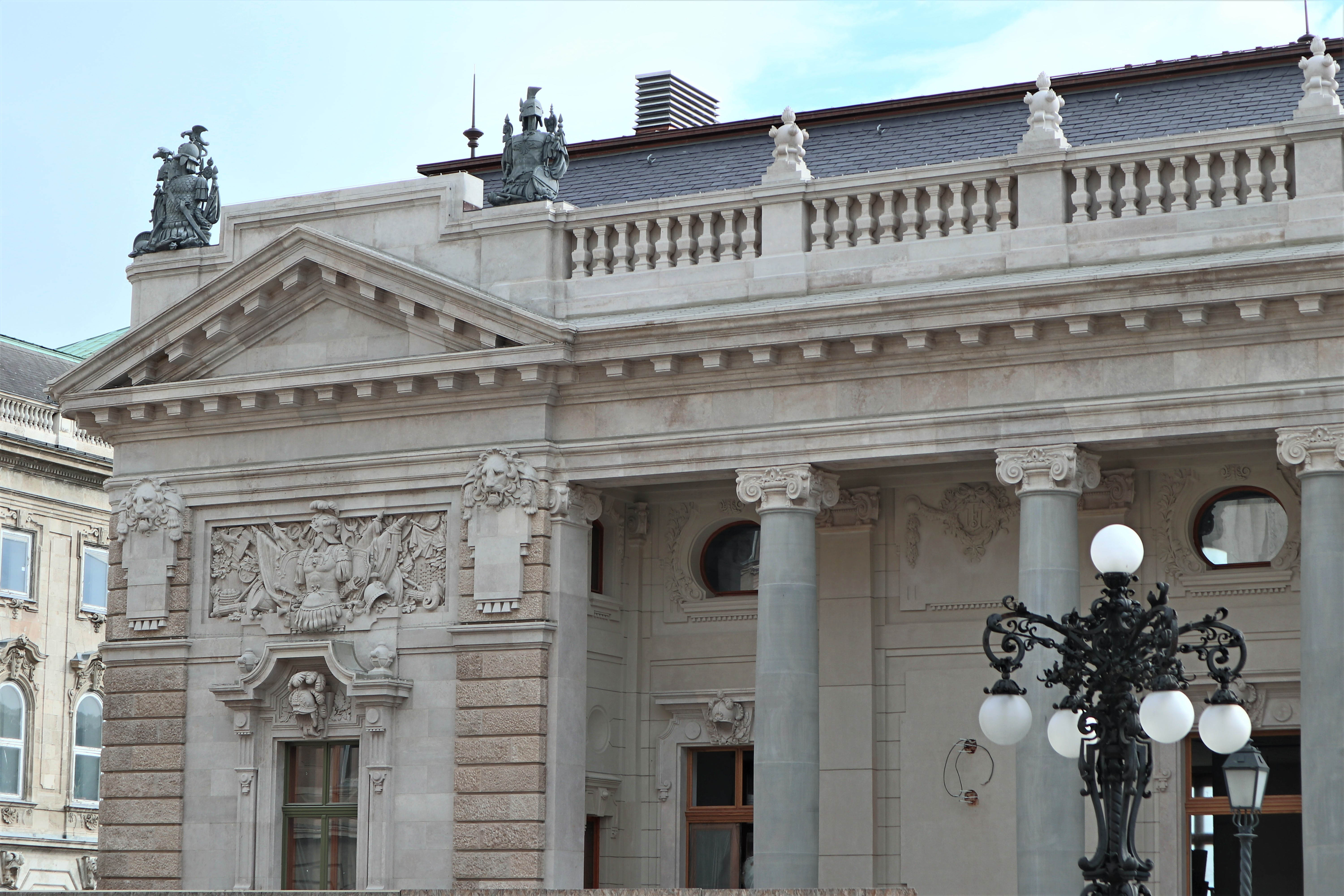 A Főőrség keleti oldalának részlete a Hunyadi-udvarból fotózva. Az állványok már nem takarják az épületet, így láthatóvá váltak a homlokzat domborművei (Fotó: Fliszár Nóra/pestbuda.hu)