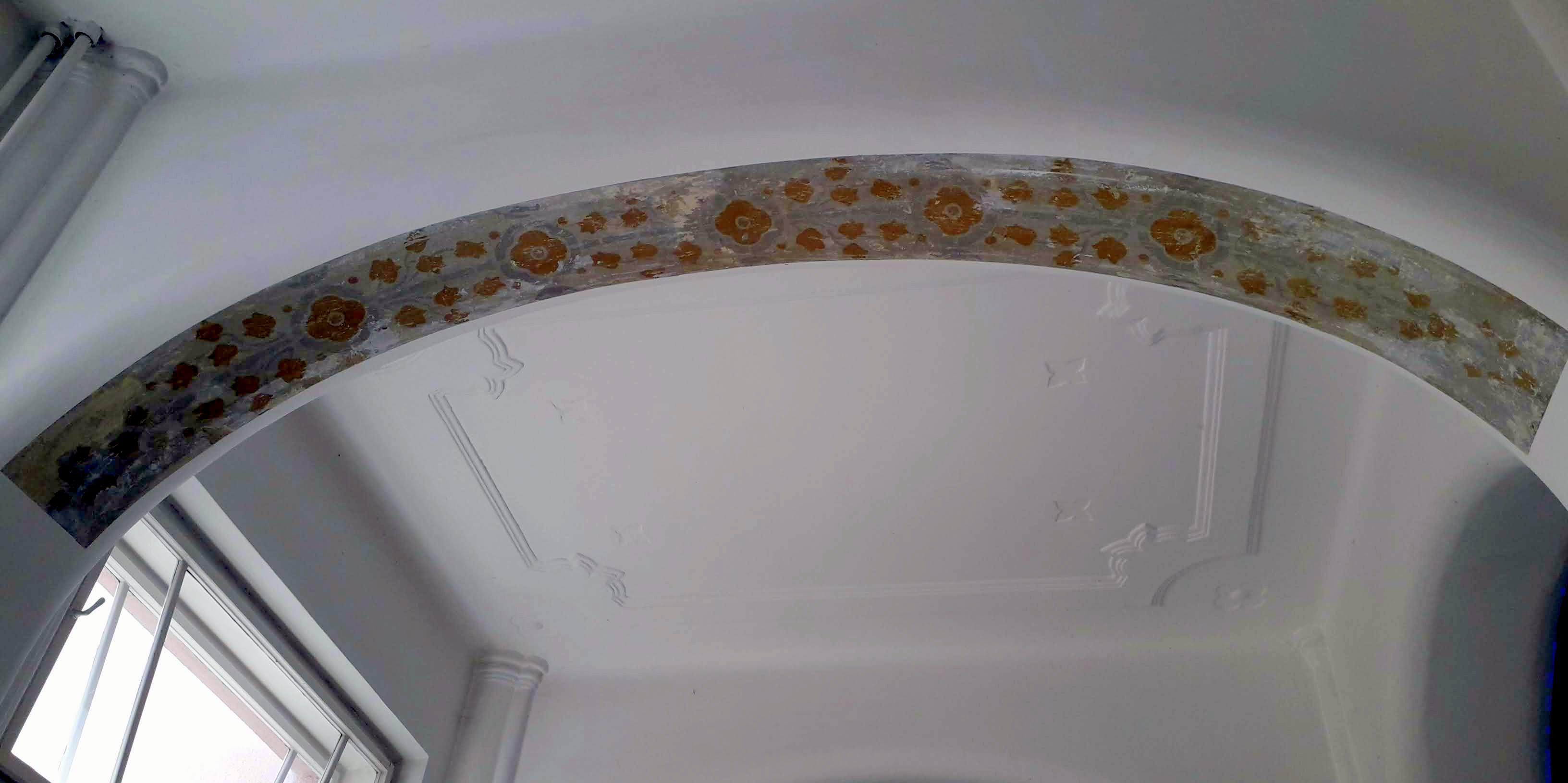 Finom részletek: valamikor ilyen magyaros díszítőfestése volt a gimnázium belső tereinek, de figyelemre méltó a mennyezet ornamentikája is (Fotó: Viczián Zsófia/pestbuda.hu)