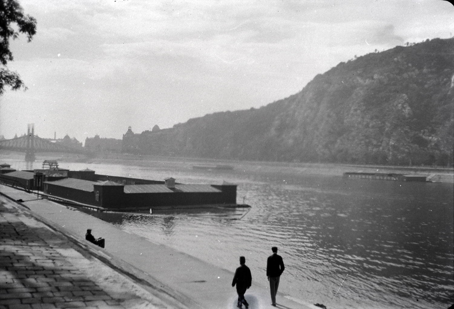 Úszóstrand a Dunán 1934-ben, háttérben a Ferenc József híd (Fotó: Fortepan)