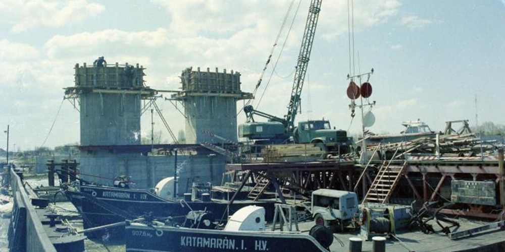 A hárosi Duna-híd, azaz a Deák Ferenc híd építése 1988-ban (Fotó: Fortepan/Uvaterv)