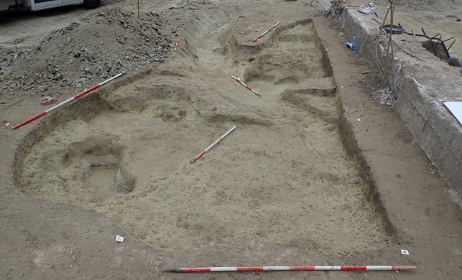 Az intenzív újkori bolygatás ellenére, nagyobb gödörkomplexumok (több gödör egymásba ásva) is előkerültek a területen. Nagy mennyiségű állatcsont (főleg szarvasmarha), és középső rézkori cserépedény-töredékek kerültek elő belőle (Fotó: Aquincumi Múzeum)