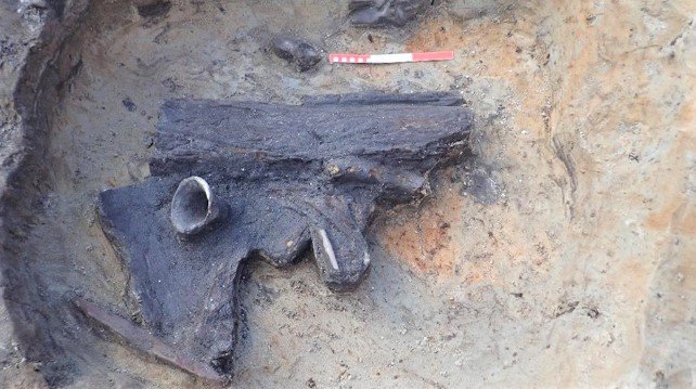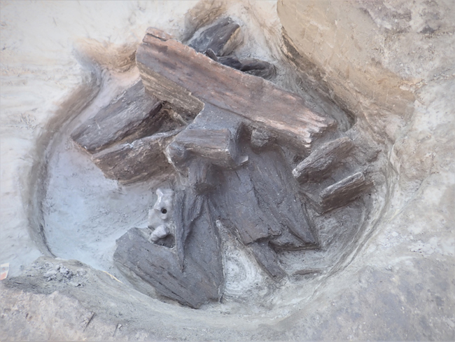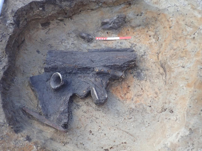 Csőtalpas edénytöredék, fadarabok és összetartozó szarvasmarha csigolyák kerültek elő az egyik gödörből (Fotó: Aquincumi Múzeum)