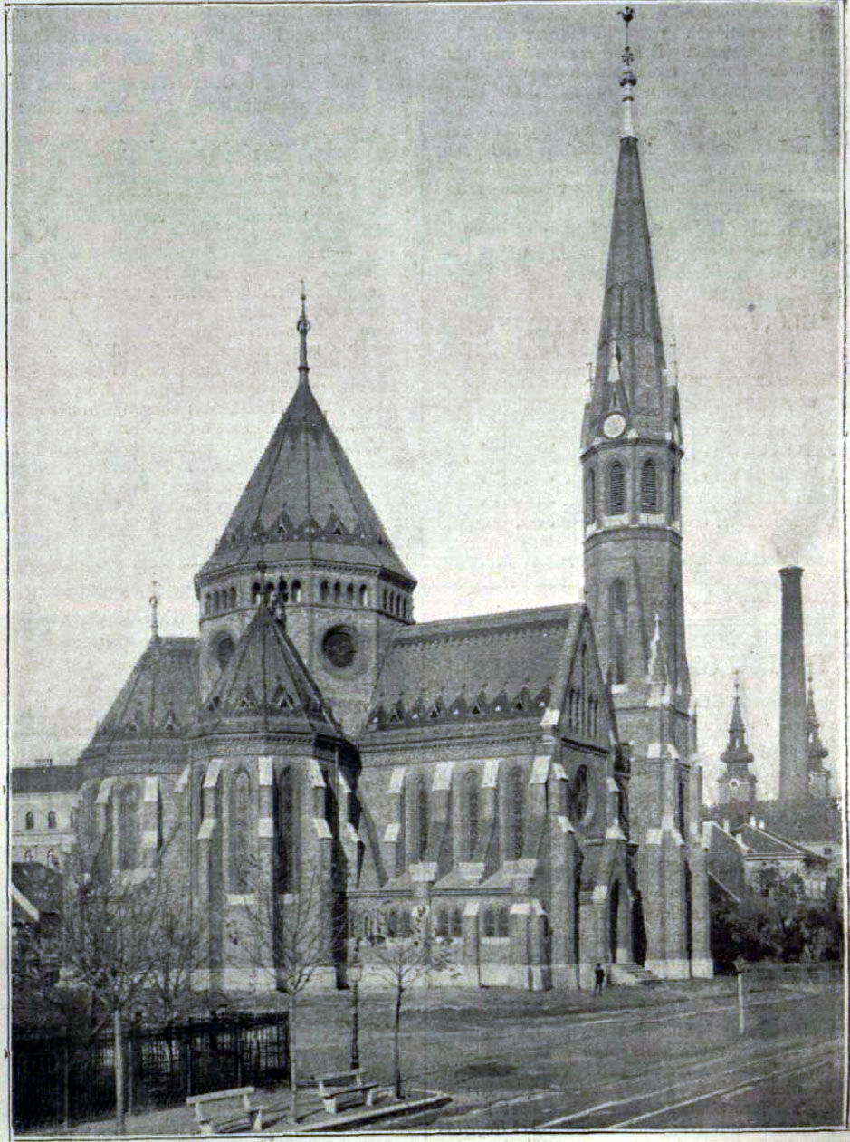 Ezért szabályos ötszög köré négy karéjt és egy bejárati hosszházat tervezett tízszögű kupolával neogótikus stílusban, nyerstégla burkolattal, amely kívülről és belülről is különleges térélményt nyújt. A neogótikus stílusú, barna-sárga-zöld mázas Zsolnay-cserepekkel fedett templom jellegzetes eleme a városképnek.