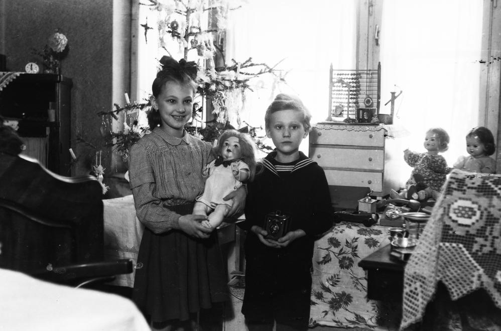 A kislánynak babát, a kisfiúnak fényképezőgépet hozott az angyal 1938-ban (Fotó: Fortepan)