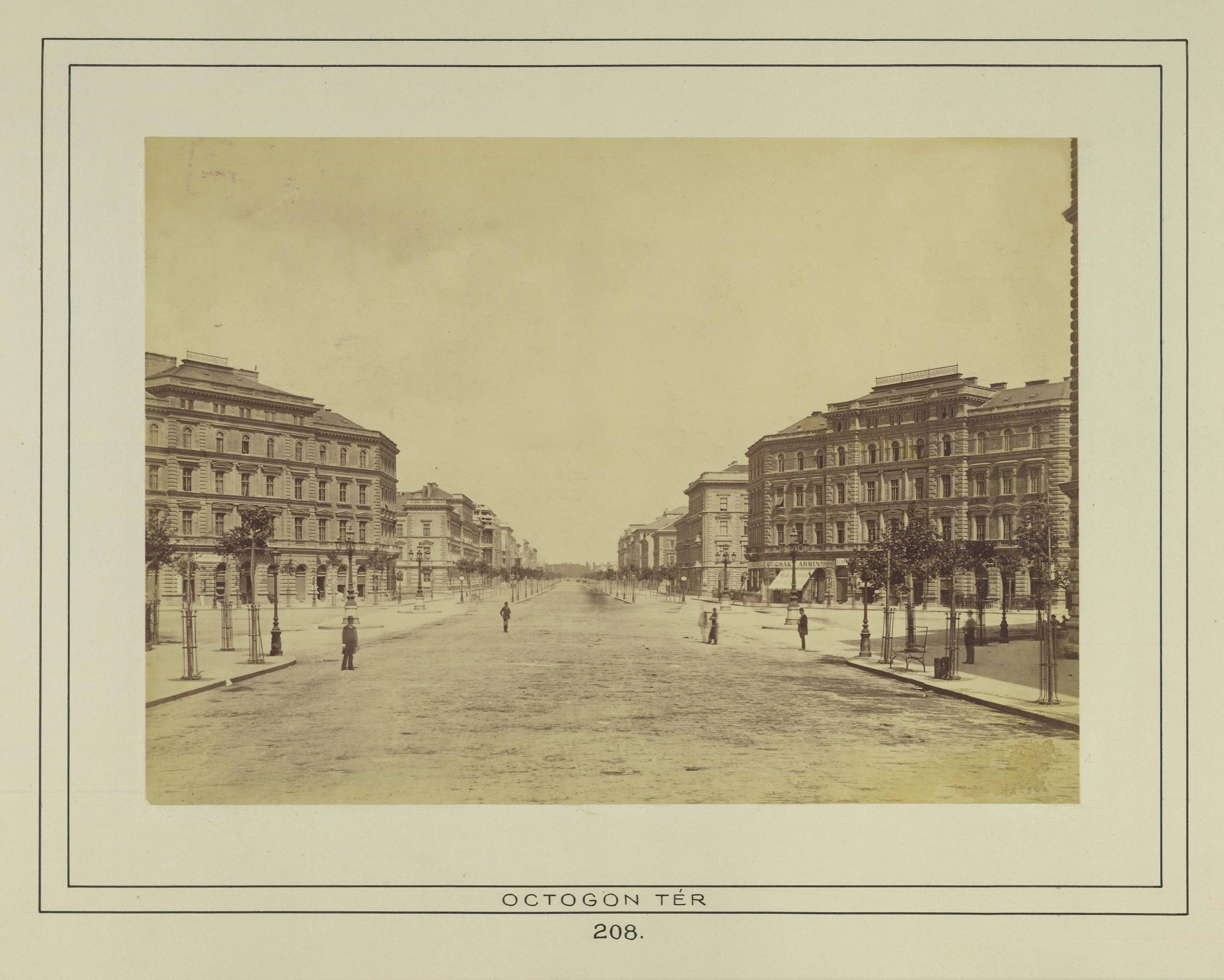 Az Andrássy (Sugár) út az Oktogonnál, a Városliget felé nézve. A felvétel 1880 körül készült (Forrás: Fortepan/Budapest Főváros Levéltára. Levéltári jelzet: HU.BFL.XV.19.d.1.06.020)