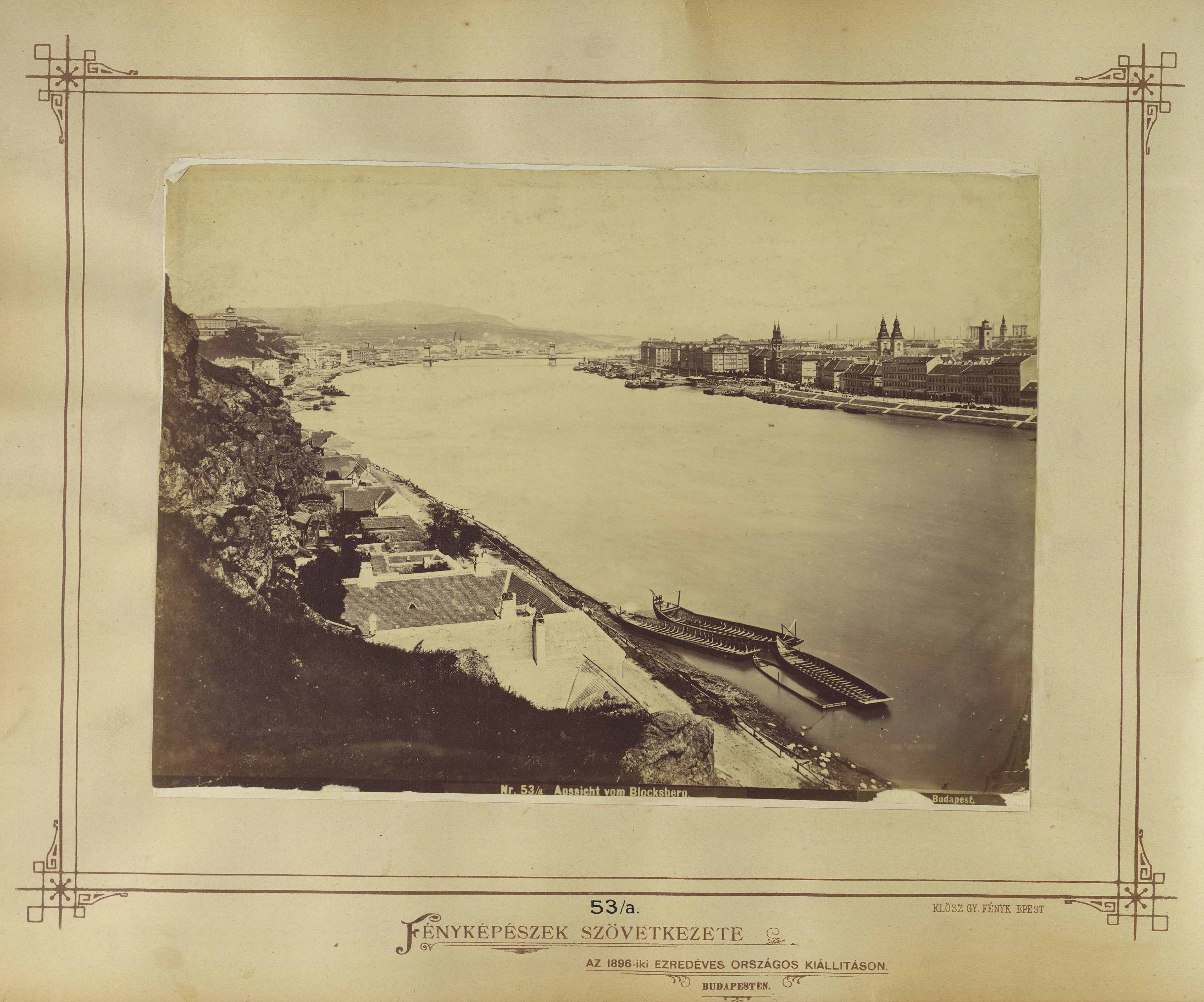 Kilátás a Gellért-hegyről a Széchenyi Lánchíd és az épülő Margit híd felé. A felvétel 1874 körül készült (Forrás: Fortepan/Budapest Főváros Levéltára. Levéltári jelzet: HU.BFL.XV.19.d.1.05.055)
