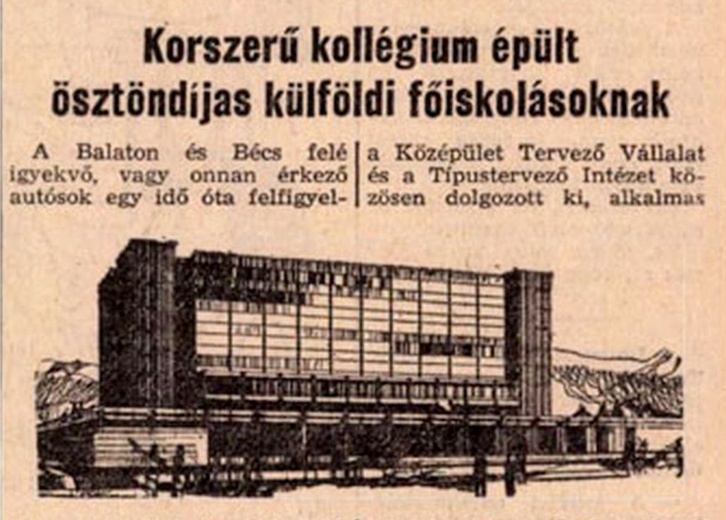 A Magyar Nemzet 1968. október 13-i száma így ír az új intézményről: „Korszerű kollégium épült ösztöndíjas külföldi főiskolásoknak. A Balaton és Bécs felé igyekvő, vagy onnan érkező autósok egy idő óta felfigyeltek a Budaörsi úton létesülő, reprezentatív megjelenésű új építkezésre. Itt épül a Külföldi Ösztöndíjasok Kollégiuma, ahol 312, Magyarországon tanuló afrikai és ázsiai származású egyetemi hallgató kap majd kényelmes elhelyezést. Az építkezés befejeződött, műszaki átadását e héten kezdték meg és november végén a diákok elfoglalják új otthonukat. Hofer Miklós és Török Ferenc építészek (KÖZTI) tervezték a modern kollégiumot, az építkezést pedig a Középületépítő Vállalat bonyolította le. A nyolcszintes épület négy sarkán vasbetontornyok emelkednek, ezekben helyezték el a lifteket, a lépcsőket, a mellékhelyiségeket. Az alsó szinteken sorakoznak az igazgatási helyiségek, fölöttük a húsz tanterem, a felső emeleteken pedig a kétszemélyes kollégiumi szobák. Háromszáz férőhelyes nagy előadóterem épült a teraszos alsó szinten.”