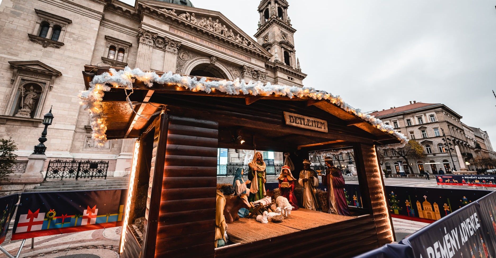 Betlehemi jászol a Szent István-bazilika előtt 2020 decemberében (Fotó: adventbazilika.hu)