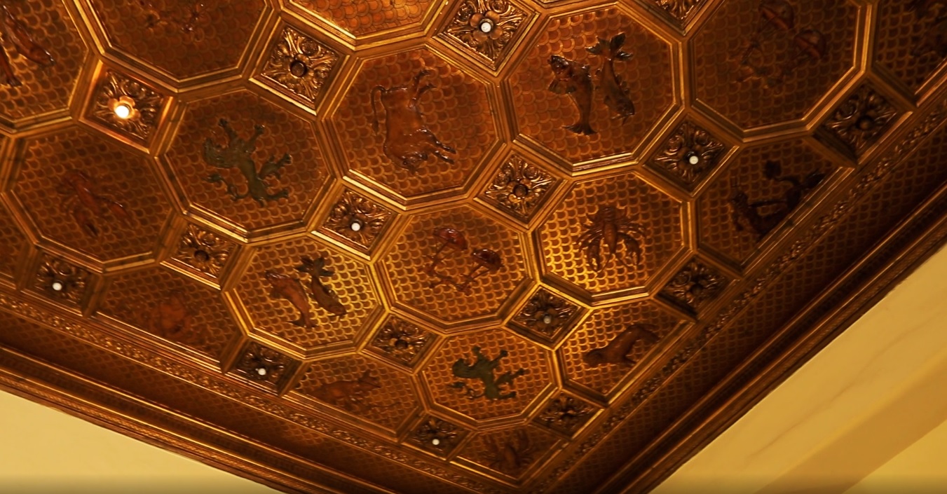 A Róheim család egykori ebédlőjének mennyezetét csillagjegyeket ábrázoló Zsolnay csempék borítják (Fotó: részlet a Magyar Corvin-lánc Testület videójából)