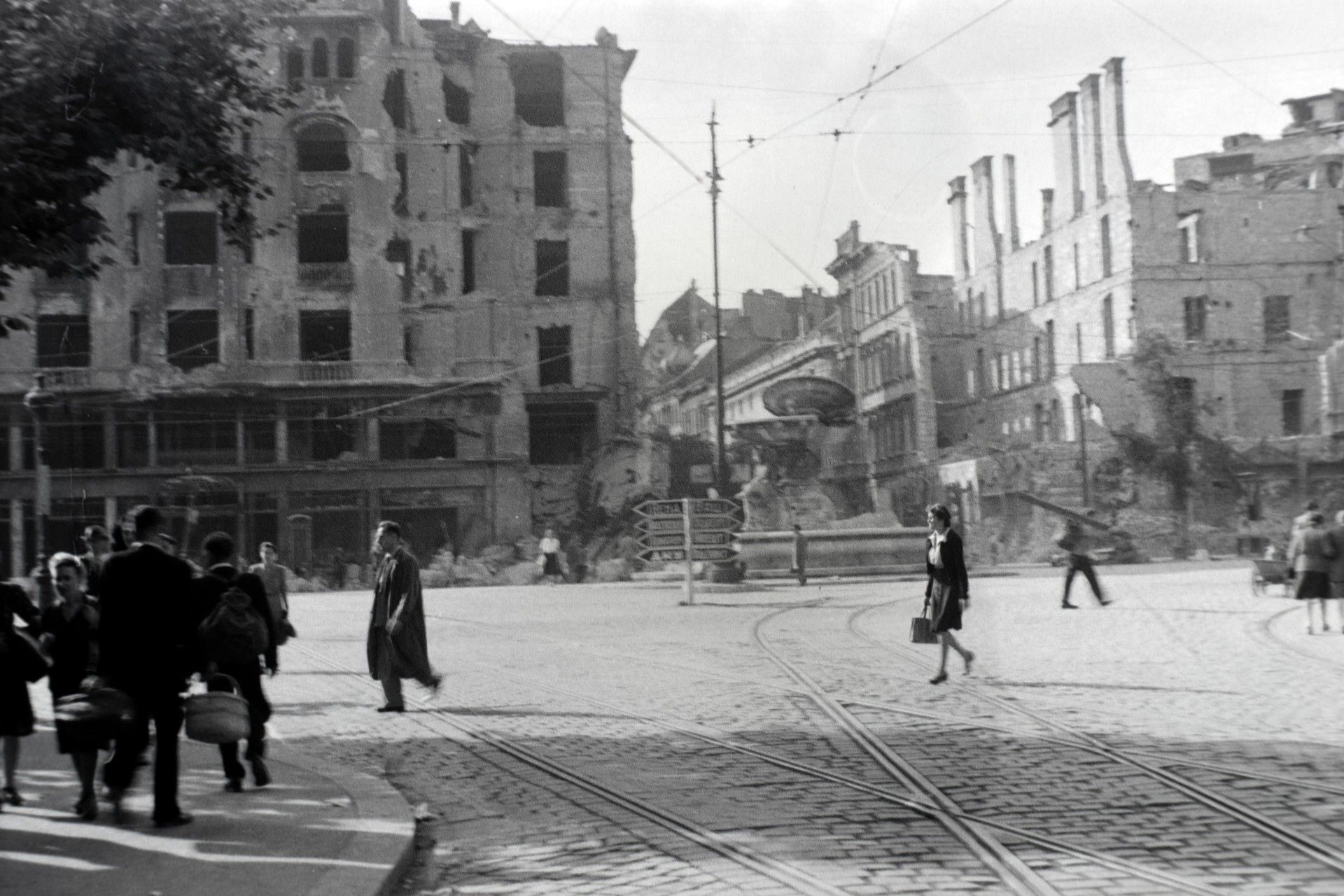 A szétlőtt Geist-ház és Pintér-ház a Danubius-kút maradványával 1945 tavaszán (Fotó: Fortepan/Képszám: 45557)