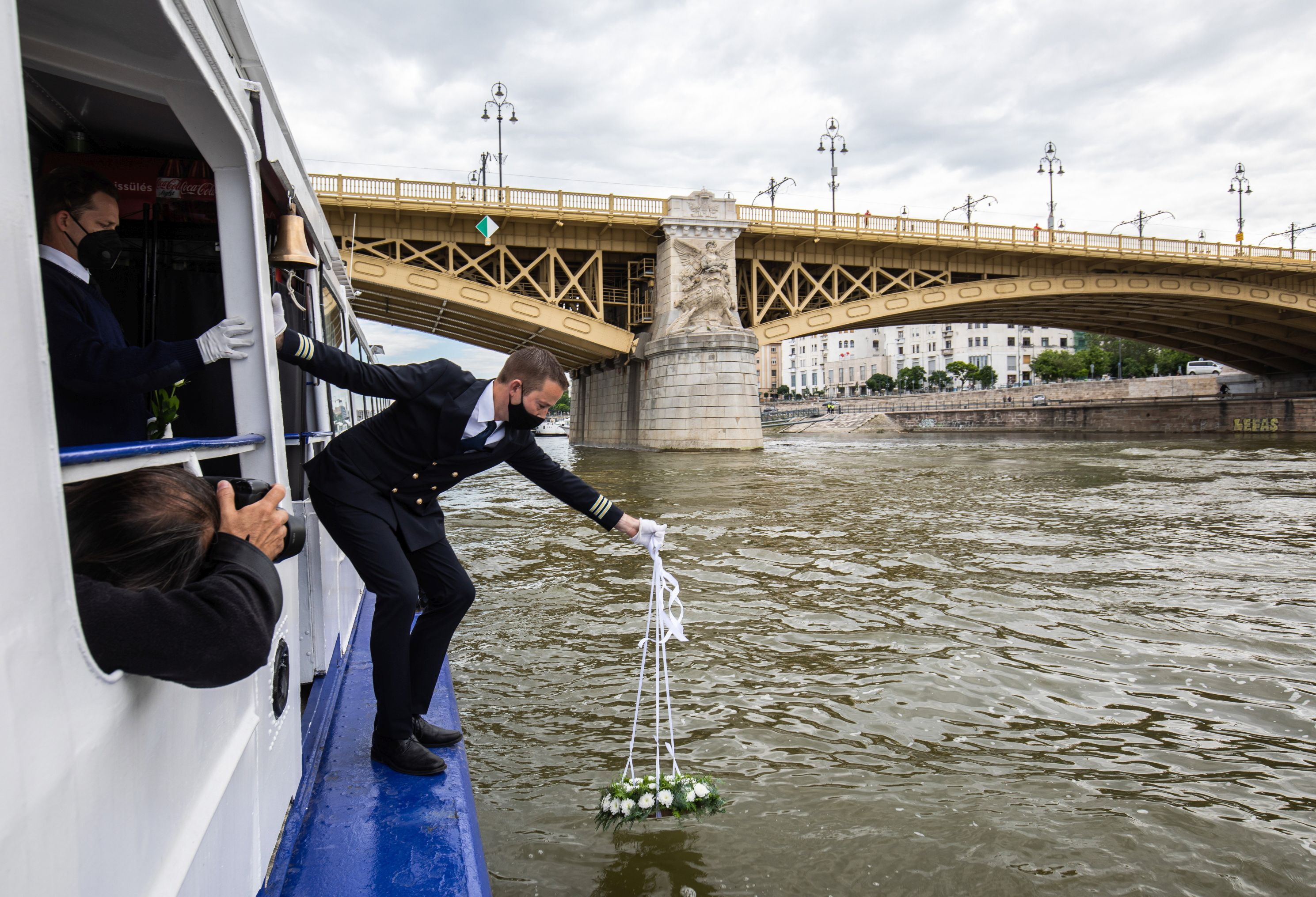 Vízre helyezett koszorúval is megemlékeztek a Hableány sétahajó balesetének áldozatairól az ökumenikus megemlékezésen (Fotó: MTI/Mohai Balázs)
