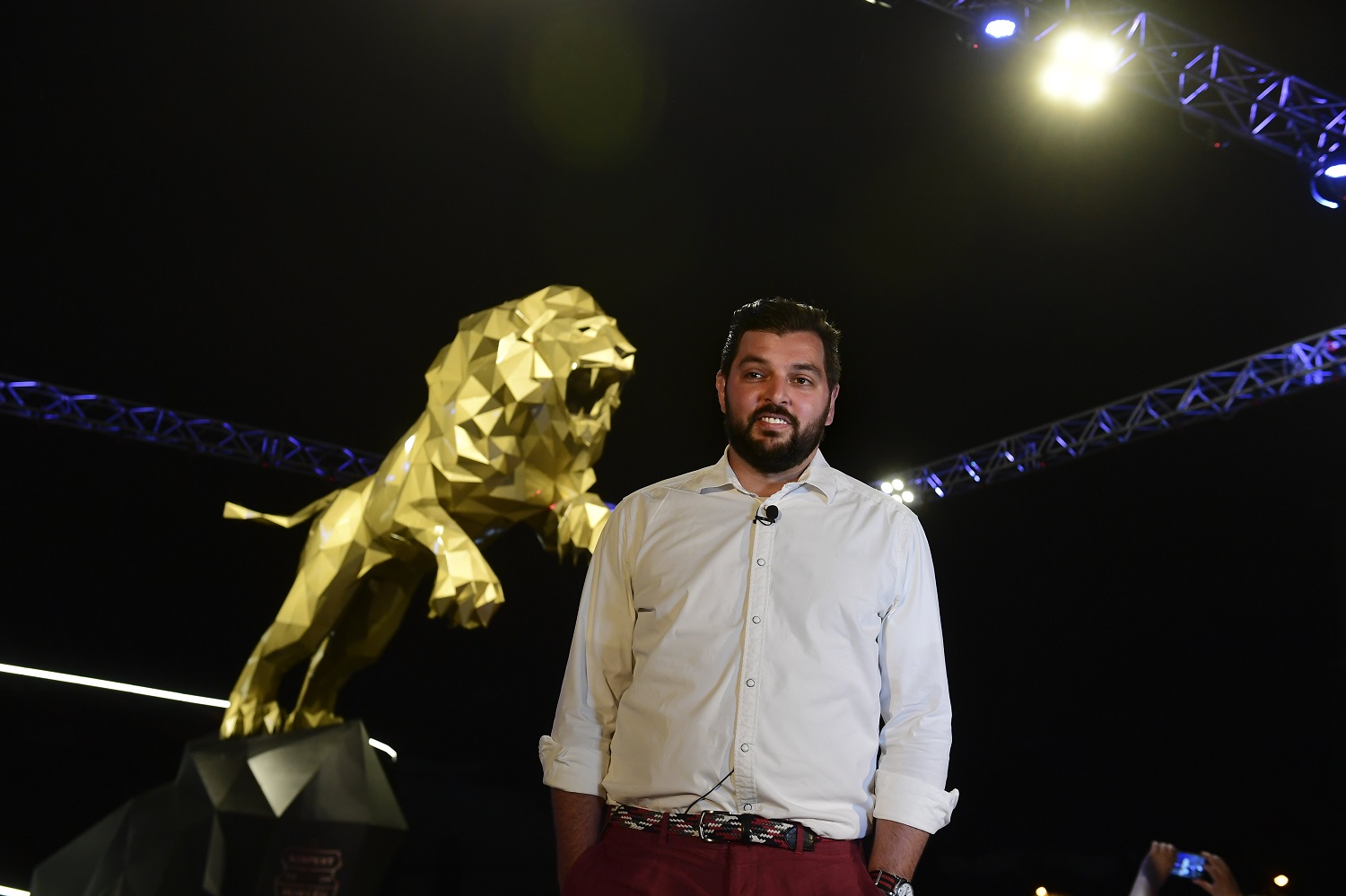 Szőke Gábor Miklós szobrász, mögötte a Honvéd arany oroszlánja (Fotó: MTI/Koszticsák Szilárd)