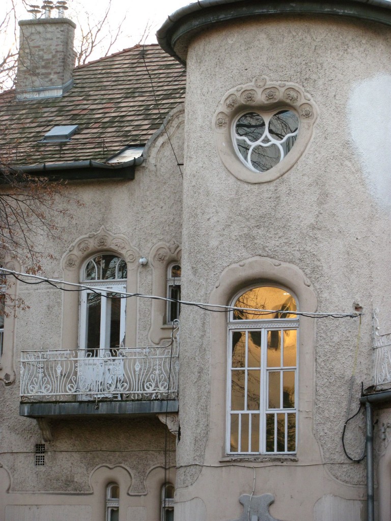 A bejárati kapu felett az emeleten kosáríves nyílásban erkélyajtó van, előtte az íves erkély inda- és virágdíszes kovácsoltvas korláttal (Fotó: pestbuda.hu)