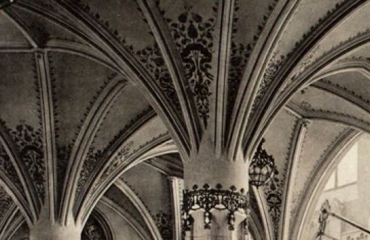 A díszterem pilléreit és mennyezetét is bordák hálózzák be (Forrás: FSZEK Budapest Gyűjtemény/ Fellner Sándor: A Magyar Királyi Pénzügyminisztérium palotája, 1908)