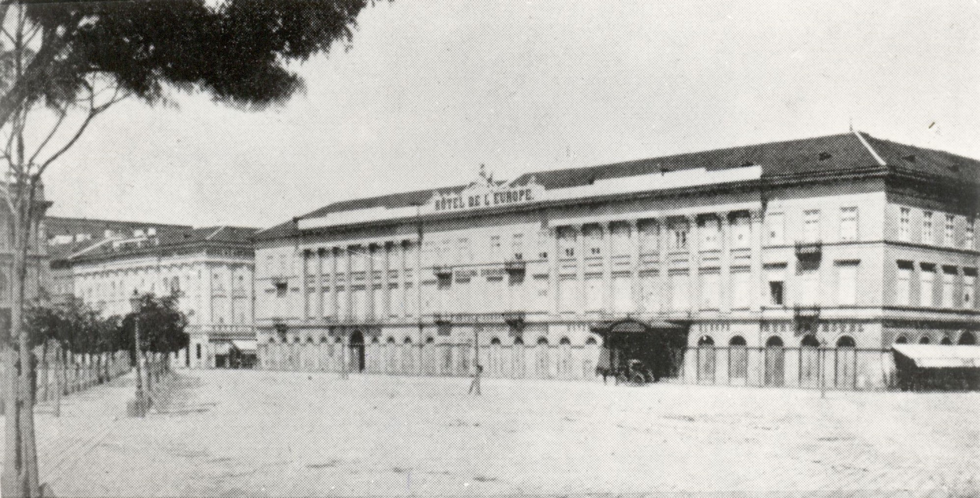 Az Európa Szálló az 1860-as években, ahol 1880. június 1-jén Mária badeni hercegnő szállt meg. Tetején az Európa elrablását ábrázoló névadó szoborcsoporttal (Forrás: Magyar Kereskedelmi és Vendéglátóipari Múzeum, képszám: VF_13184)