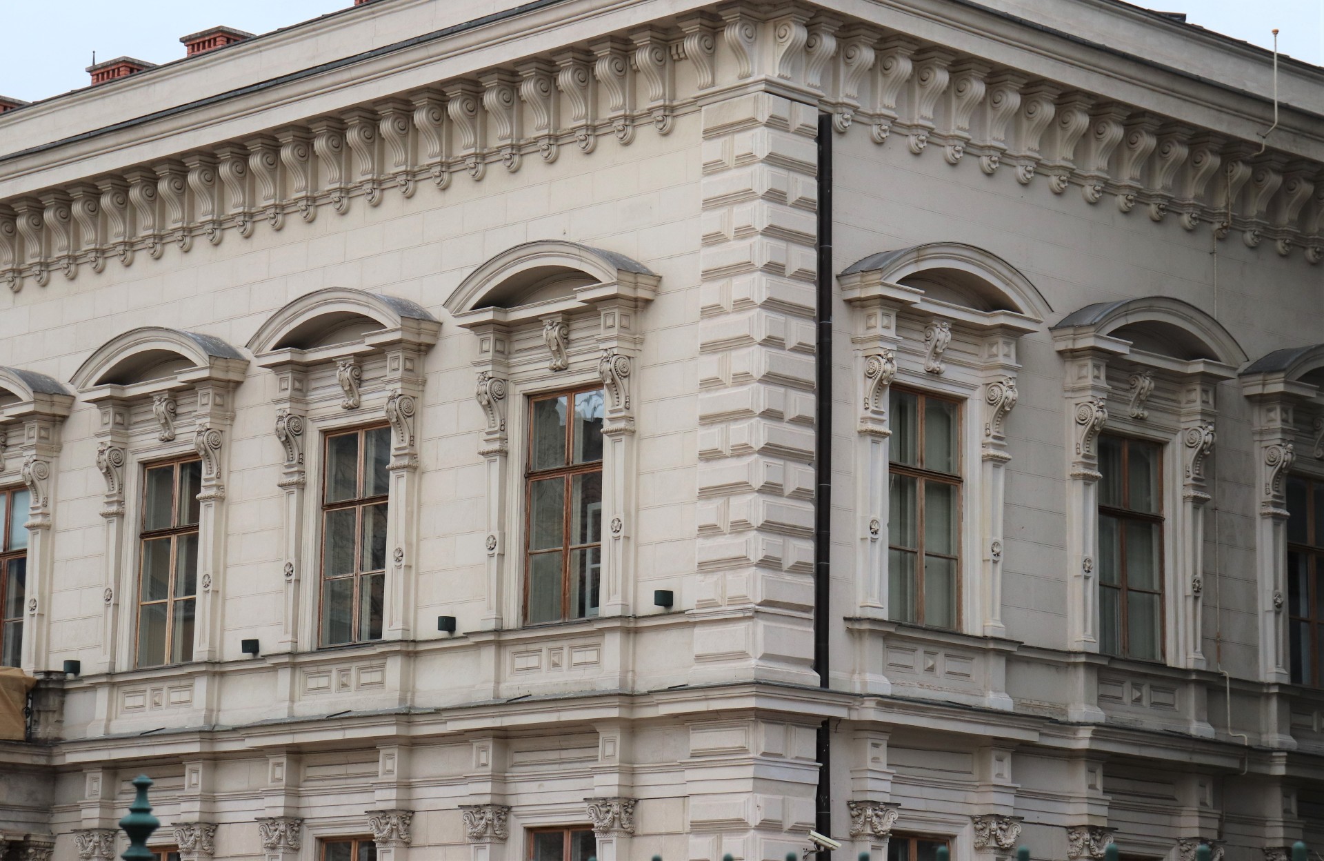 A Pollack Mihály téri Festetics-palota első emeleti, déli oldalán, a kép jobb szélén egy ablaktengely szélességben helyezkedett el a tálaló. A tőle északra, a képen balra elhelyezkedő két ablak mögött a palota ebédlőjét alakították ki, amit az erkély mögötti háromtengelyes szalon követett (Fotó: Dubniczky Zsolt/pestbuda.hu)