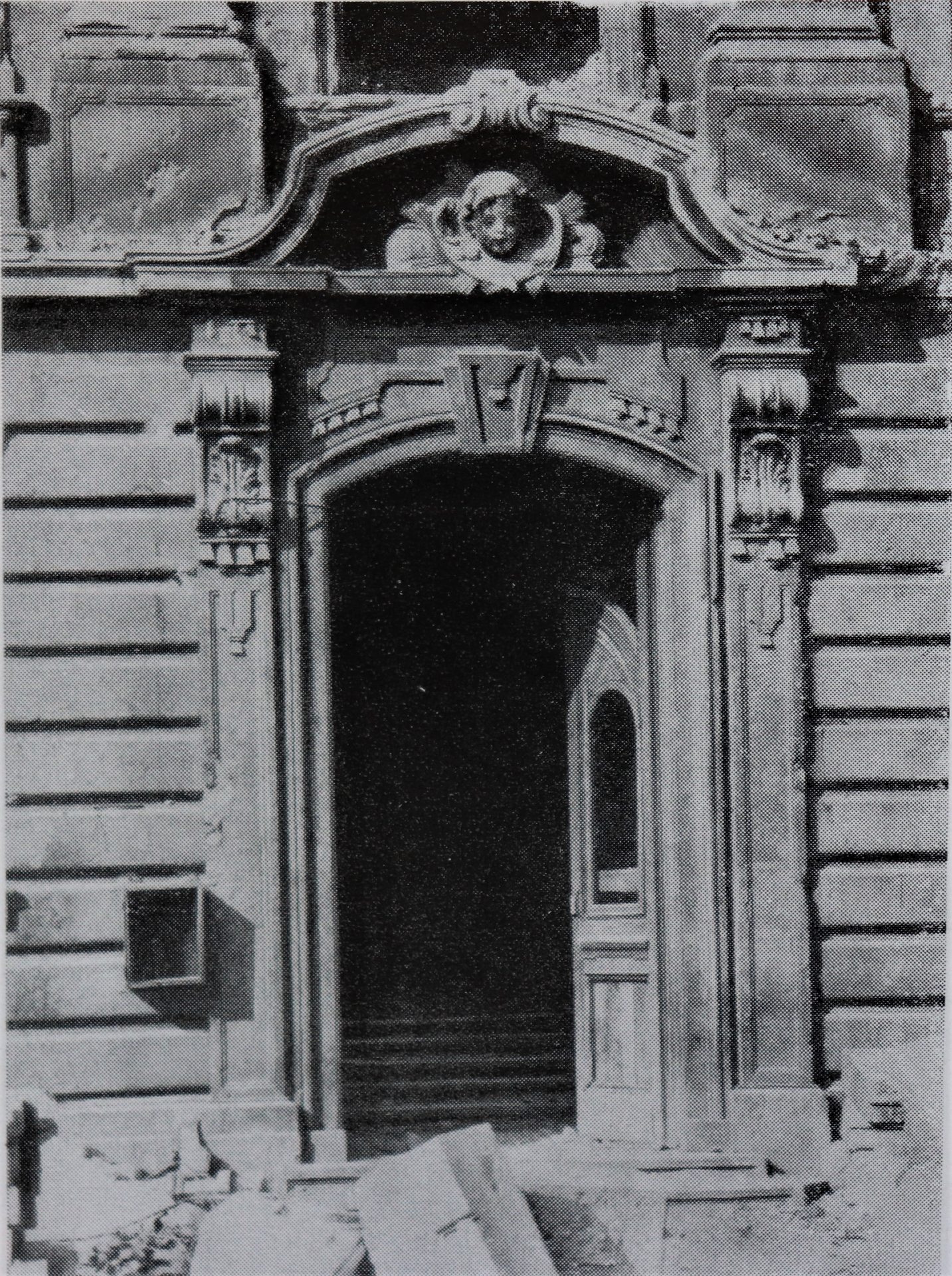 A palotakápolna angyalfejjel díszített bejárata a II. világháború után (Forrás: Czagány István: A Budavári Palota)