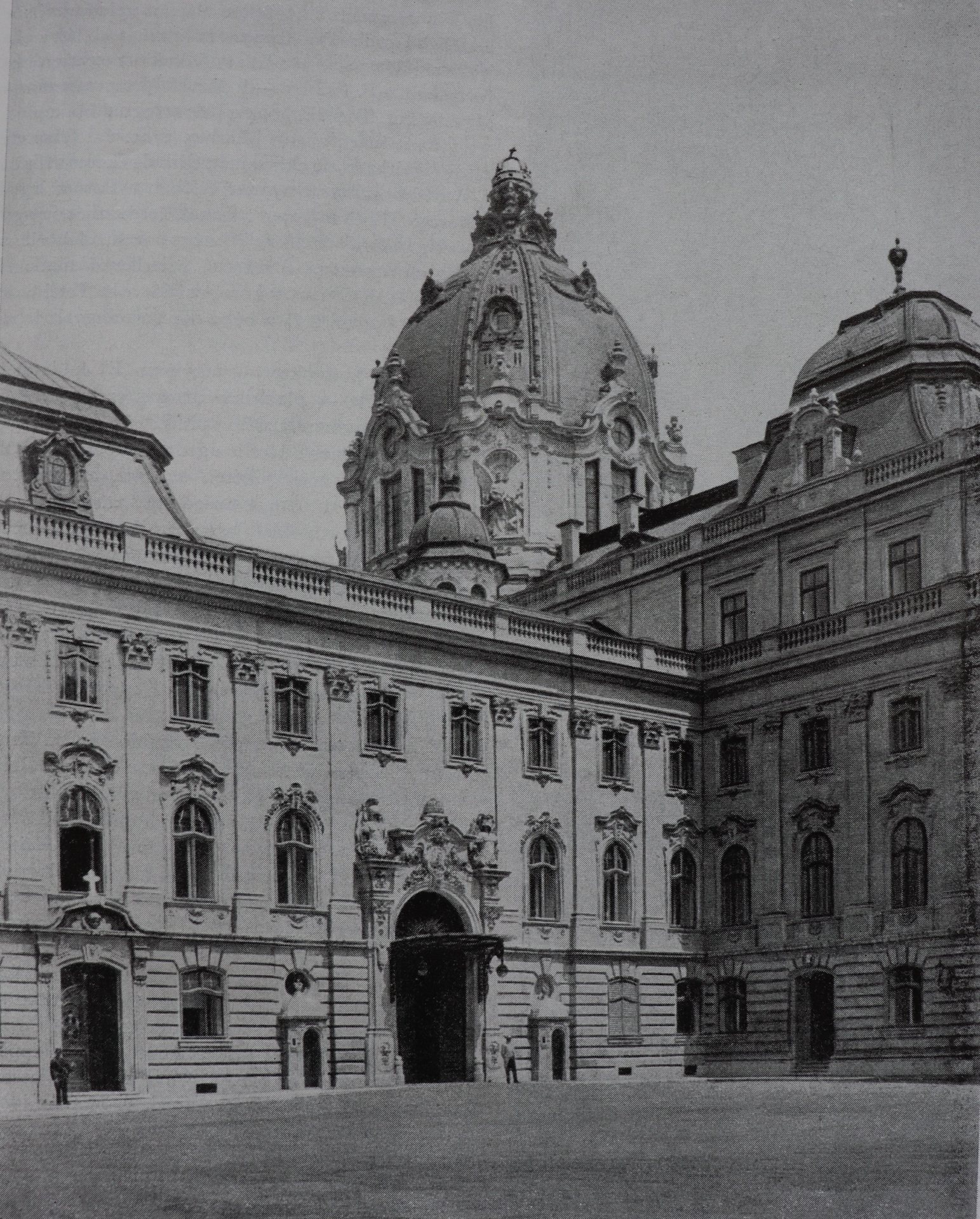 A királyi palota Hunyadi-udvara 1936-ban. Balról a Mátyás-kút, ami a palotakápolna északi homlokzatának támaszkodott. A kápolna nyugati homlokzatának falát hatalmas, két emeletet átfogó, félköríves ablakok törték át (Forrás: Fortepan/Képszám: 39253)
