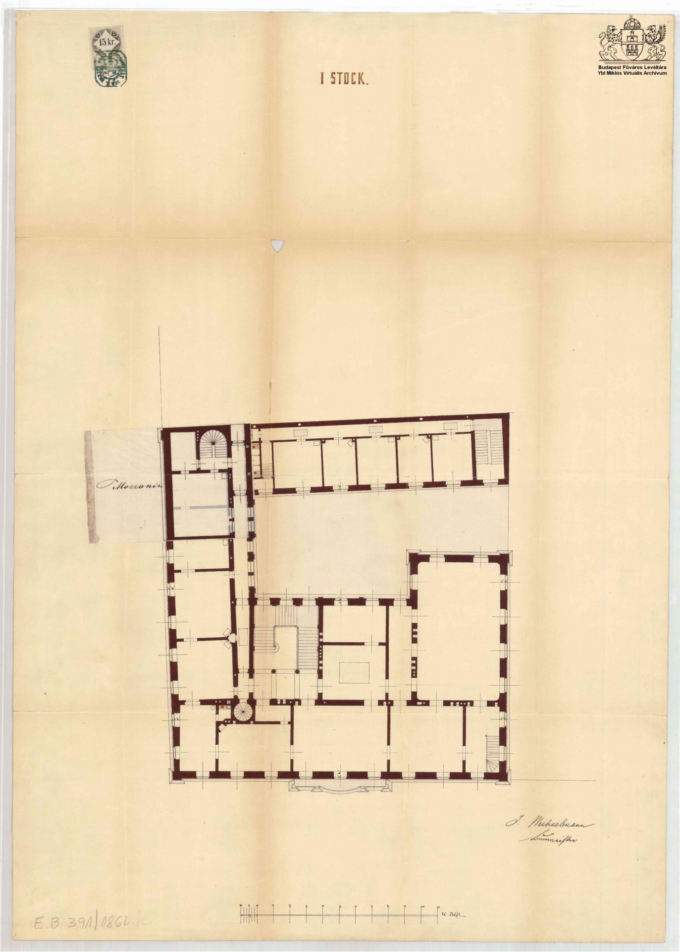 A Festetics-palota első emeleti alaprajza. Bal oldalon (mai Bródy Sándor utcai oldal) a női lakosztály után, a lépcső melletti helyiségben alakították ki a palota házi kápolnáját. Az alaprajz jobb alsó sarkán (mai Pollack Mihály téri oldal) a Pollack Mihály térre egy ablaknyílással néző tálaló található, amit az alagsorban elhelyezkedő konyhával lépcső kötött össze. Tőle balra (északra) az ebédlő, illetve a kapu fölötti erkély részen a háromtengelyes szalon helyezkedett el (Forrás: Ybl Miklós Virtuális Archívum, hu_bfl_xv_17_b_312_391_1862_c_1)