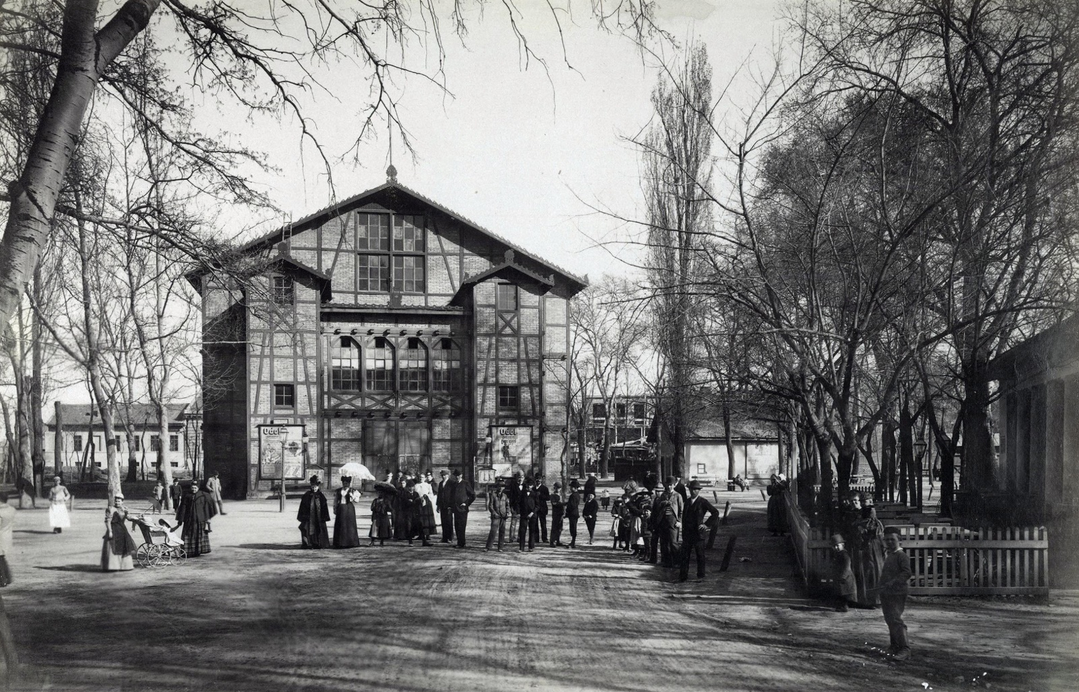 Klösz György 1890 után készült felvétele a favázas Városligeti Aréna épületéről. Előtte a Városligeti Színkör valamennyi tagja (Forrás: Fortepan/Budapest Főváros Levéltára)