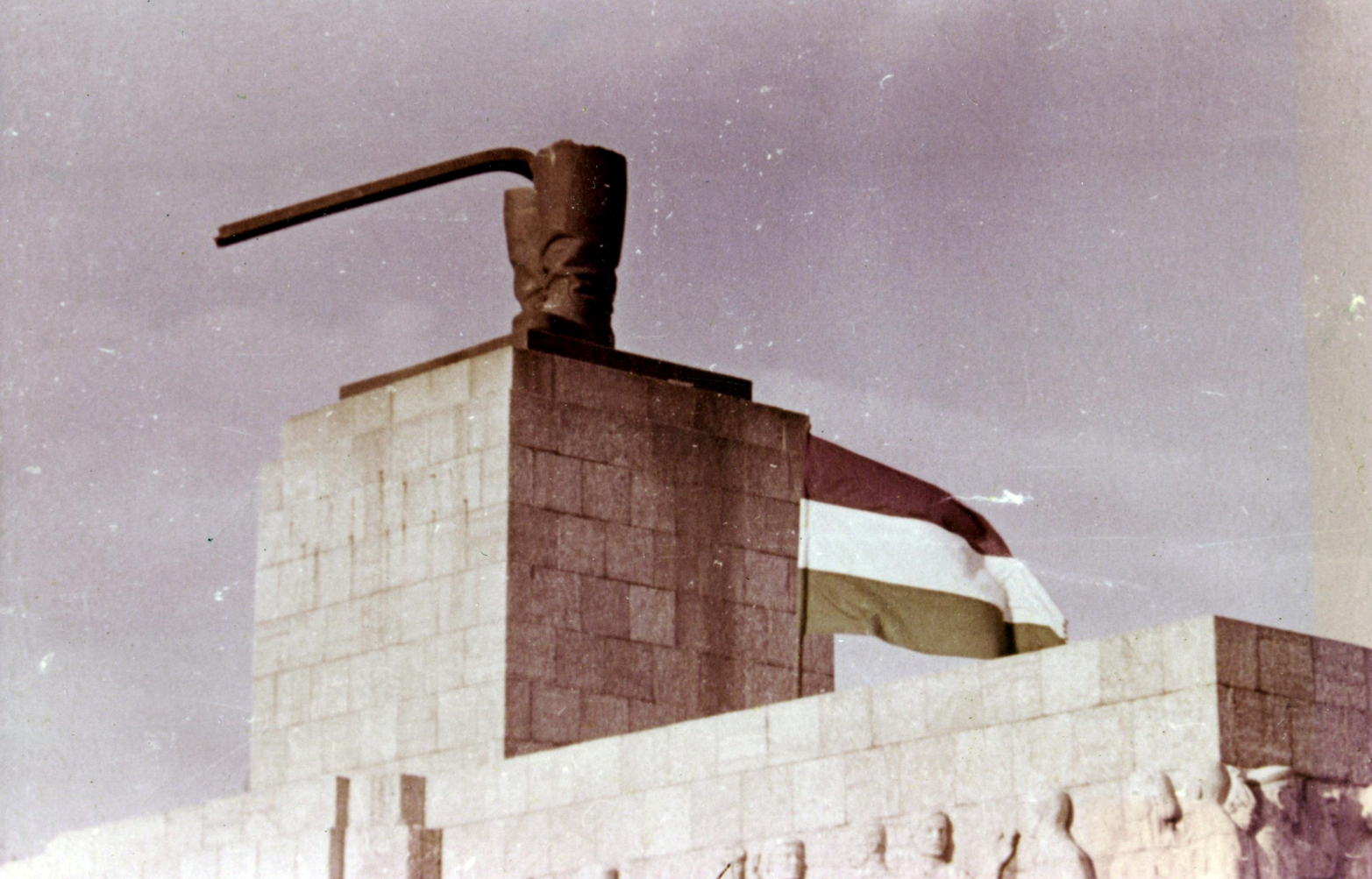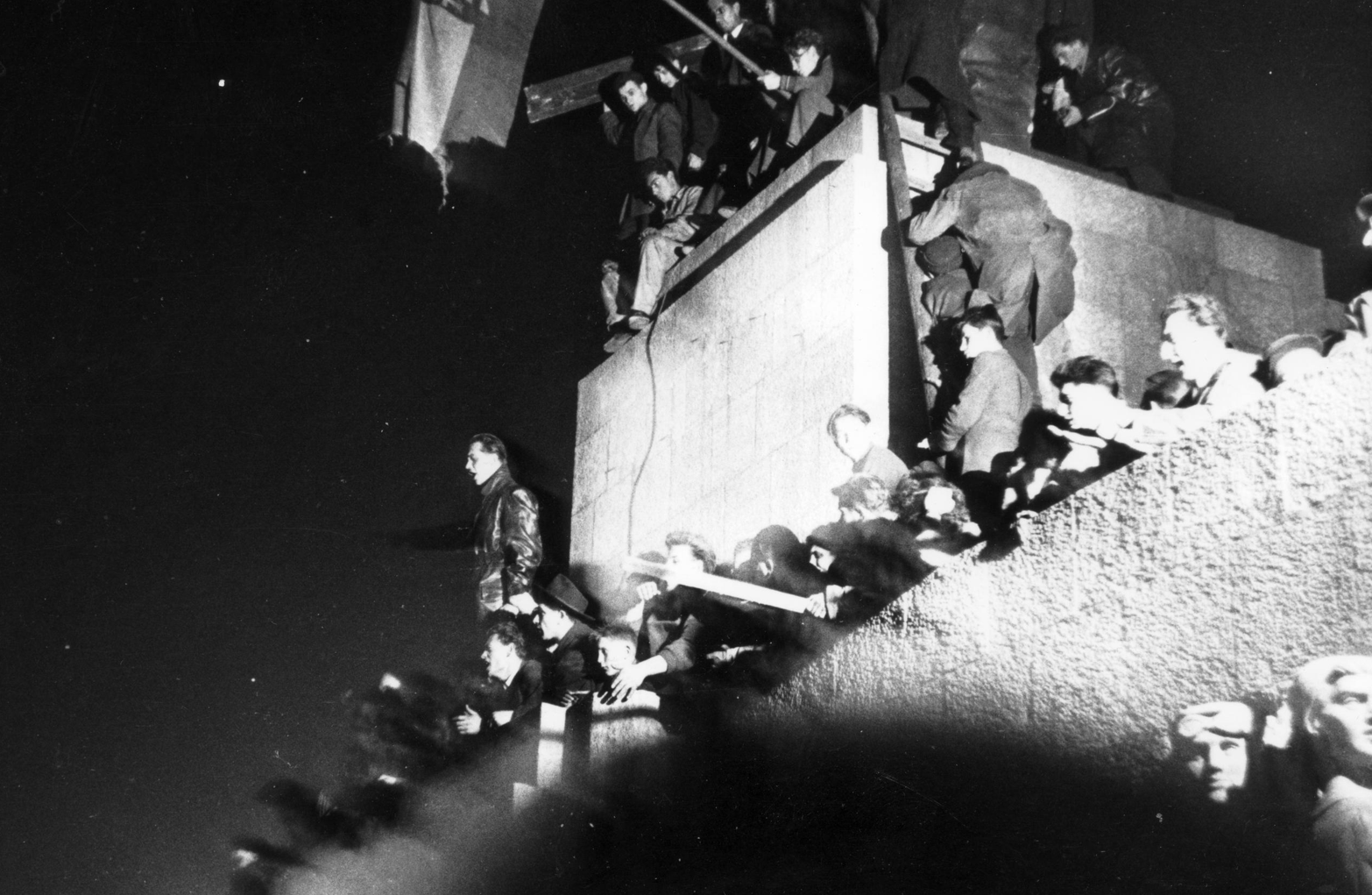 Esti mámor az 1956-os forradalom idején a dísztribünön, a Sztálin-szobor maradványánál (Forrás: Fortepan)