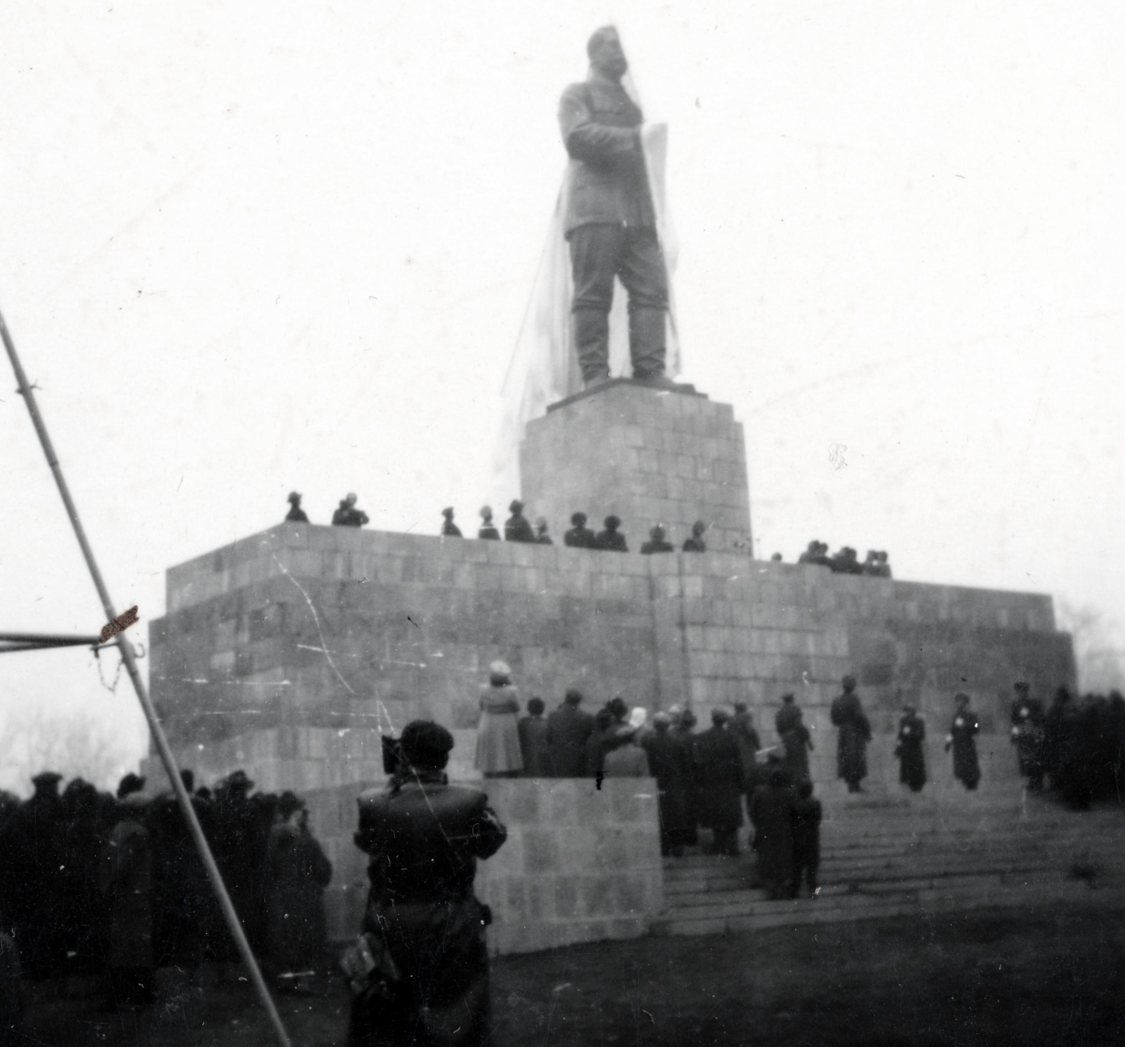 A Sztálin-szobor avatása 1951. december 16-án. A szobor öntéséhez provokatív módon felhasználták a Kossuth téren álló, de a háborúban megrongálódott gróf Andrássy Gyula lovas szobrot is (Forrás: Fortepan)