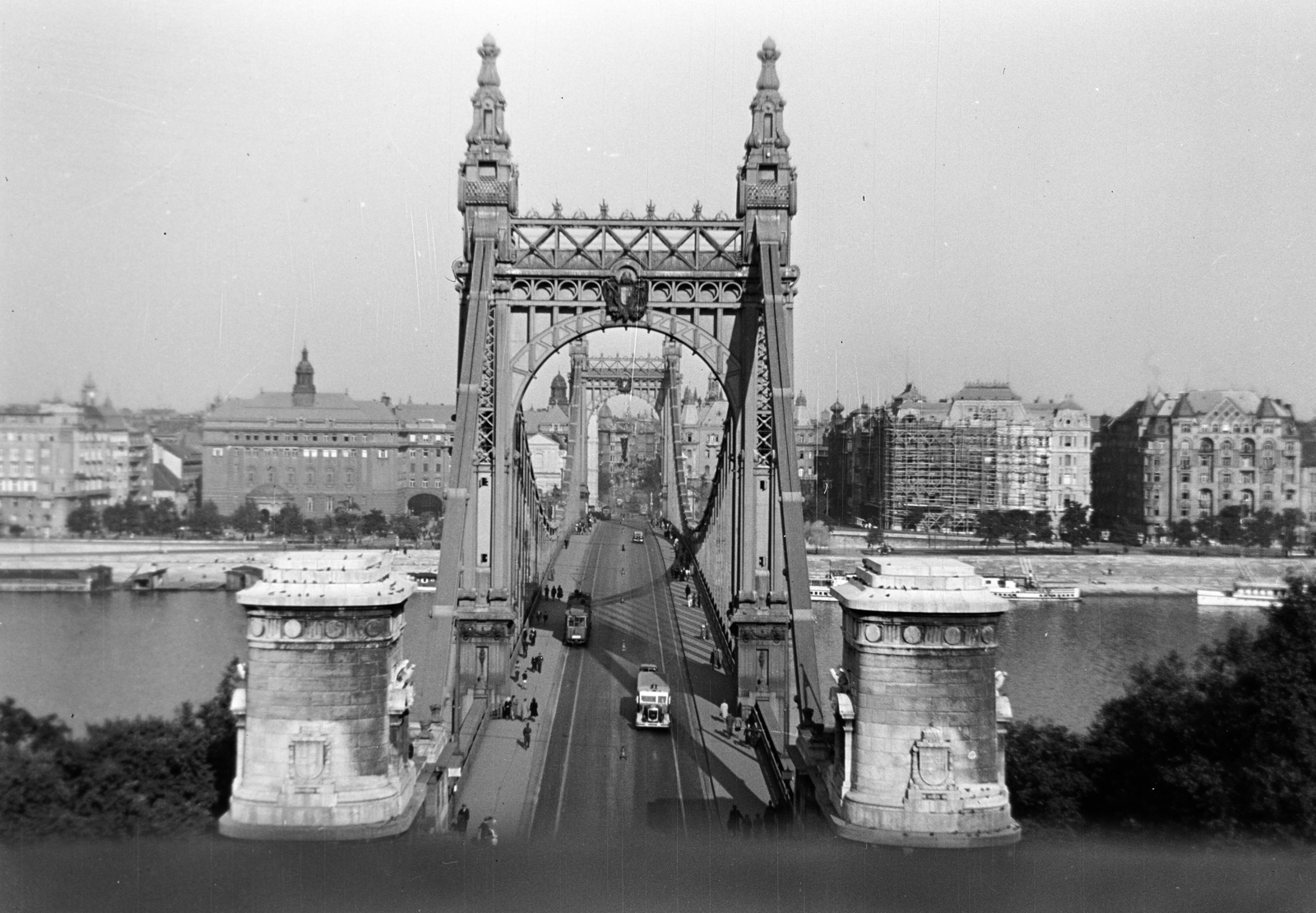 Minden egy kézben, villamos, autóbusz az Erzsébet hídon 1936-ban (Fotó: Fortepan/Képszám: 266055)