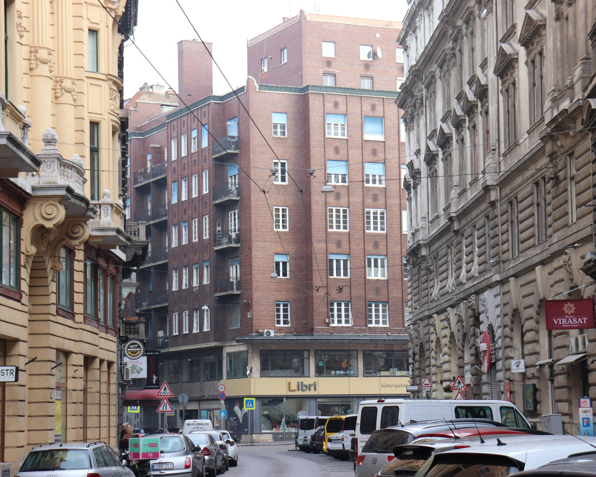 Az egykori Marczibányi-ház helyére 1937-ben egy többemeletes, vörös téglás ház épült (Fotó: Dubniczky Zsolt/pestbuda.hu)