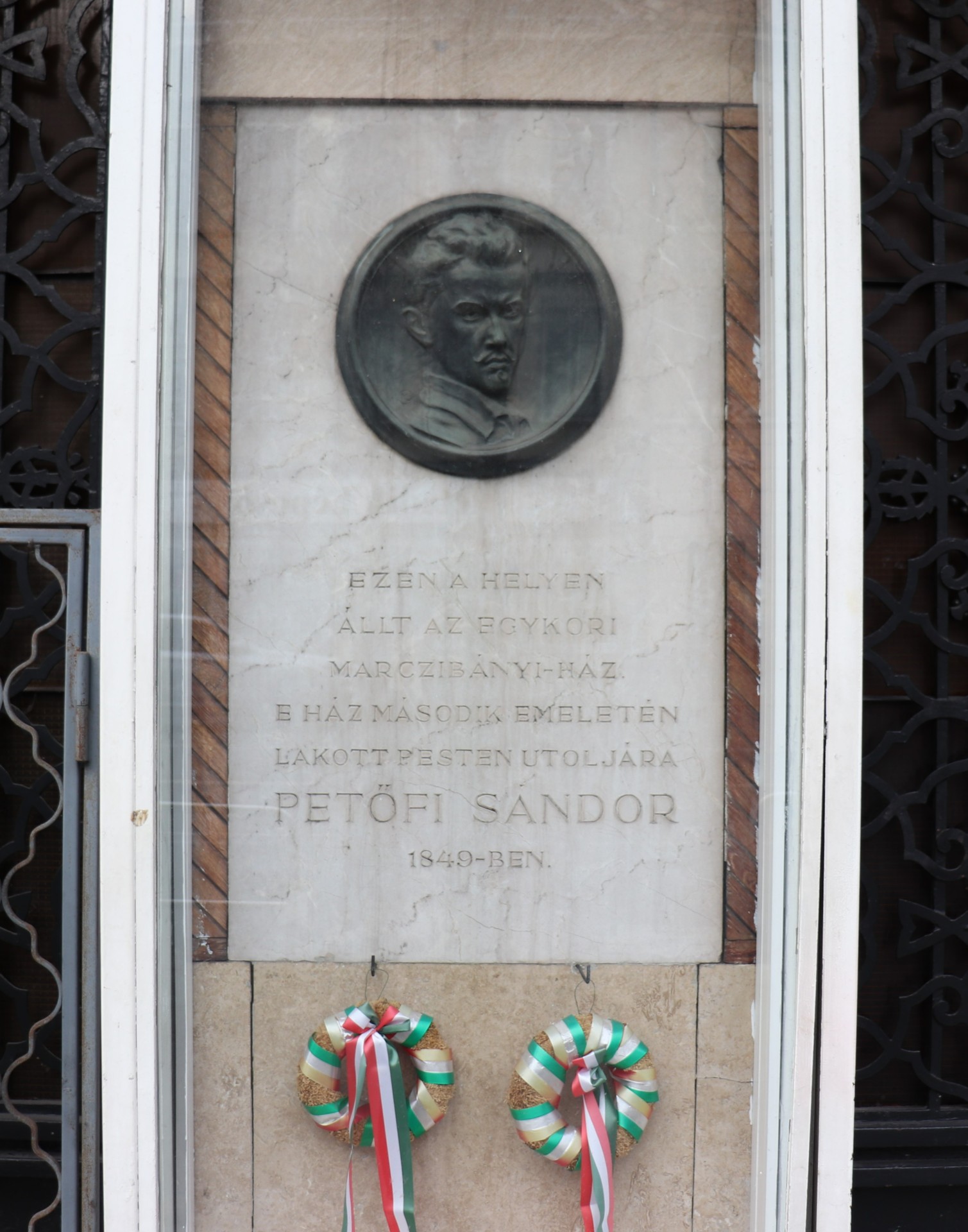 A mai Rákóczi út 12. szám alatti, egykori Marczibányi-ház helyén épült vörös téglás ház vitrinjében elhelyezett emléktábla állít emléket Petőfi utolsó pesti lakásának (Fotó: Dubniczky Zsolt/pestbuda.hu)