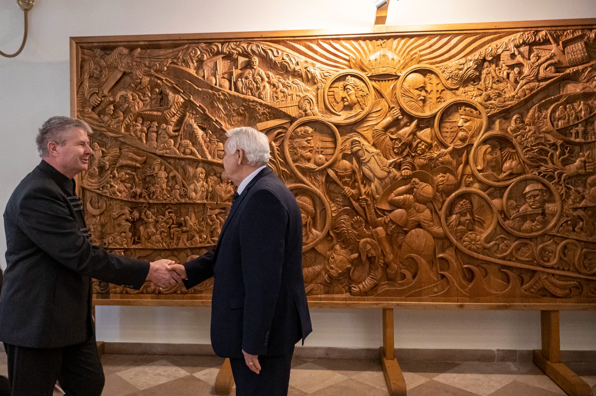 Latorcai János, az Országgyűlés alelnöke (jobbra) és Smidt Róbert fafaragó művész, a Himnusz című dombormű alkotója kezet fog a táblakép felavatásán a Barankovics István Irodaház aulájában 2023. január 20-án (Fotó: MTI/Szigetváry Zsolt)