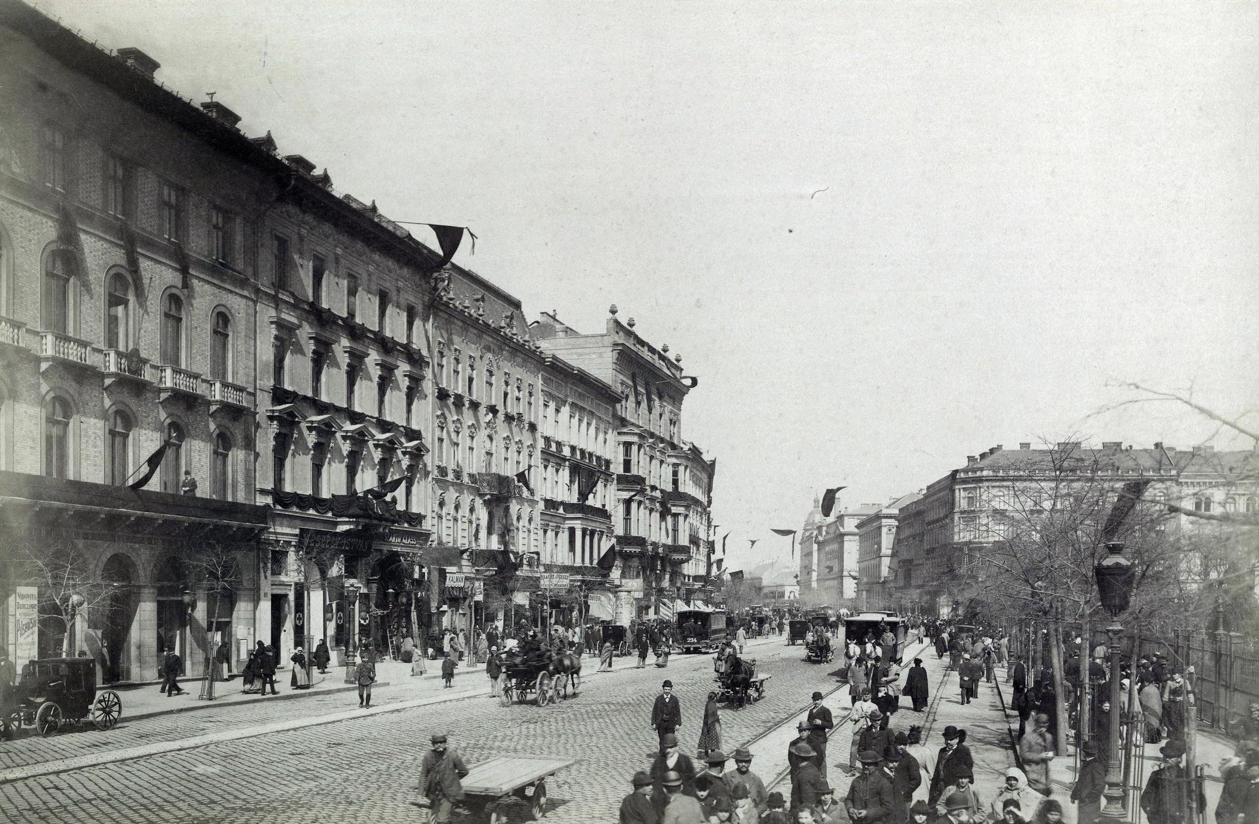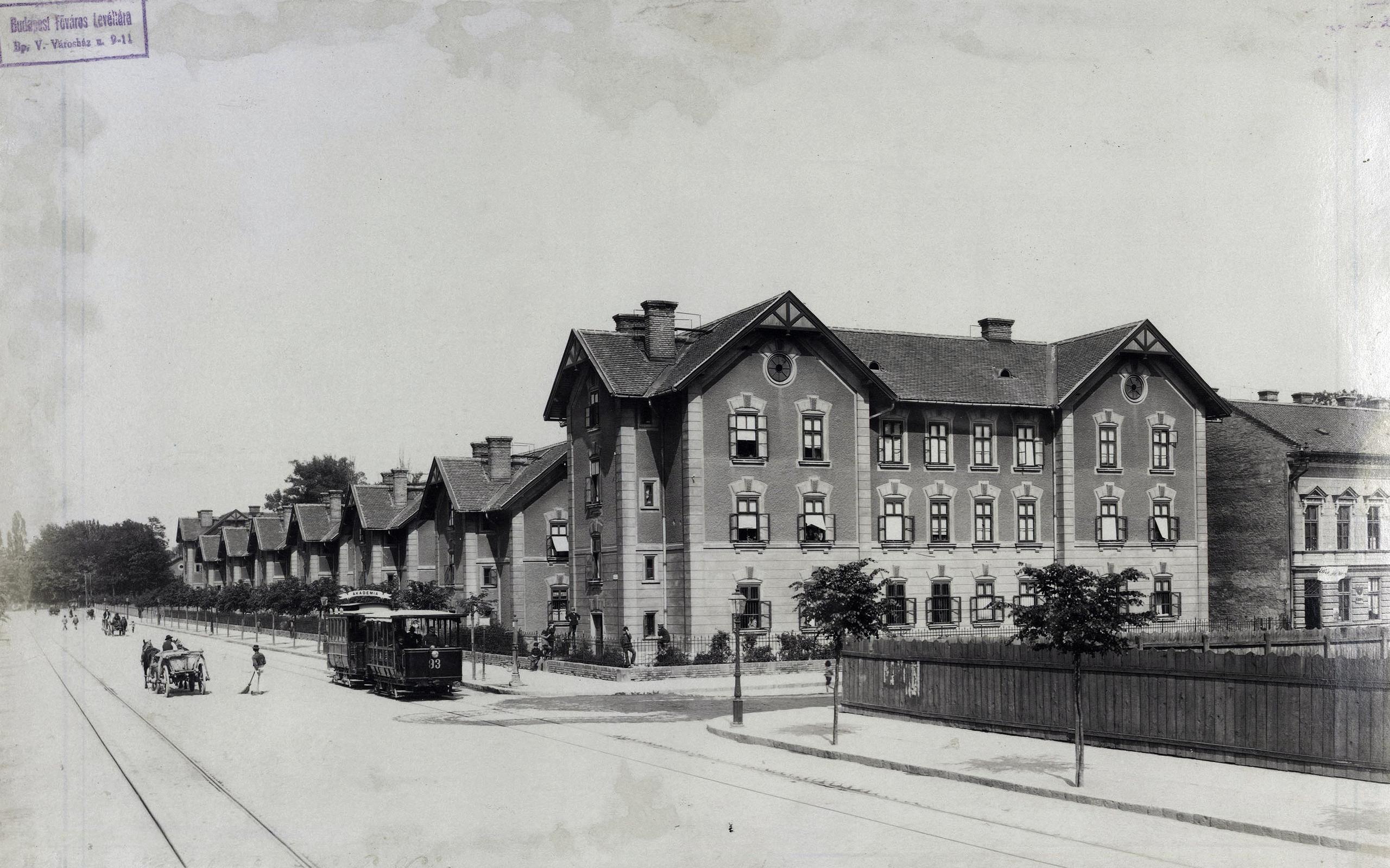 Villamos a Podmaniczky utcában, a Munkácsy Mihály utca torkolatánál, a MÁV által építtetett egykori tisztviselői és munkásházak előtt 1896 után (Fotó: Fortepan / Budapest Főváros Levéltára. Levéltári jelzet: HU.BFL.XV.19.d.1.07.030)