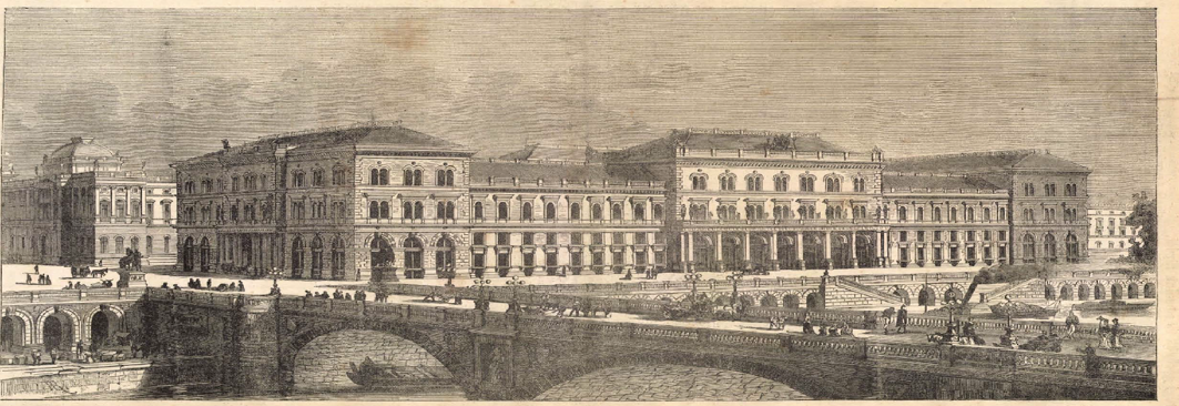Egy korai elképzelés a Vámház téri hídra, mögötte a Fővámház tervezett épülete (Vasárnapi Ujság, 1871. július 30.)