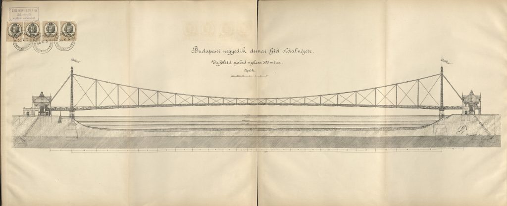 Zielinski Szilárd terve az Eskü téri hídra, a villamosokat daruk emelték volna fel (Magyar Műszaki és Közlekedési Múzeum, MMKM TEM 247.)