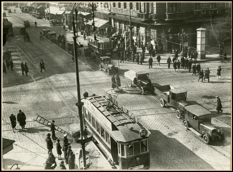 Forgalom a Nagykörút és a Rákóczi út kereszteződésében az 1920-as években – hó nélkül (Forrás: FSZEK Budapest Gyűjtemény)