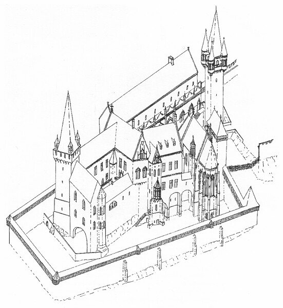 A királyi székhelyet valójában már Luxemburgi Zsigmond (1387–1437) áthelyezte Budára 1405 és 1408 között, ahol ekkor már egészen jól kiépült infrastruktúra fogadta. A budai Várhegyen a legkorábbi ismert épületet még Nagy Lajos korában emelték: egy belső udvart körülölelő, trapéz alaprajzú építmény volt, délnyugati sarkán egy toronnyal. Ez utóbbit a király öccse után István-toronyként említik a források, így valószínűleg ő építtette. A herceg halála után, az 1360-as években maga az uralkodó folytatott jelentős mértékű bővítési munkálatokat: az északi irányba nyúló újabb szárnyak egy jóval nagyobb díszudvart fogtak körül.