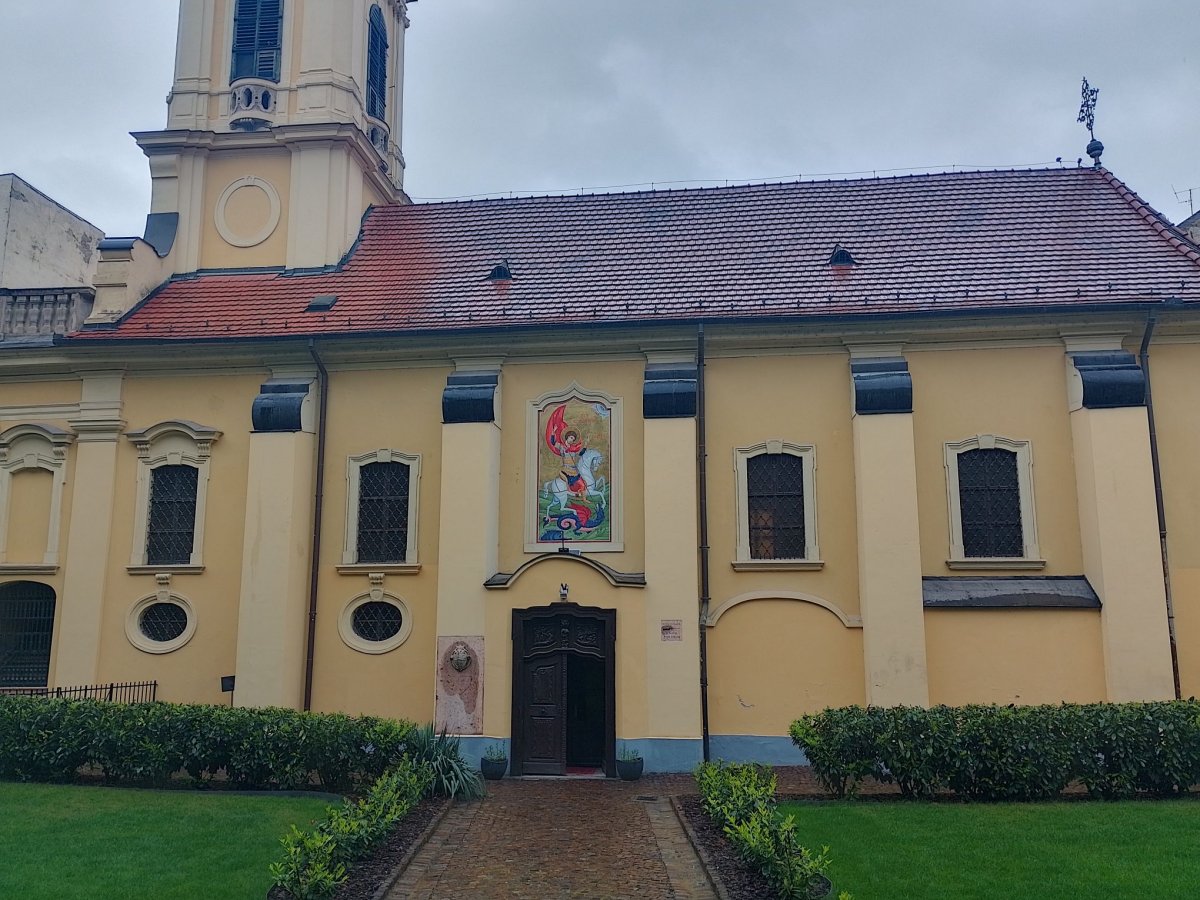 Külsőre nagyon hasonlít a barokk katolikus templomokra, csak a déli homlokzat közepén nyíló, felül egy Szent György-falfestménnyel is hangsúlyozott bejárat sejteti azt, hogy a belső más lesz. Valójában nagyon is sok a különbség, hiszen az ortodox hagyományoknak és előírásoknak felel meg: külön térrészben foglalhatnak helyet például a nők és a férfiak, melyeket ráadásul fa mellvéd választ el egymástól. Ezekből a szentély nem látható, ugyanis egy magas ikonosztáz takarja el. Rajta ugyan nyílik három ajtó, de azokon nők egyáltalán nem léphetnek be, a szertartásokban segítő férfiak (diakónusok) is csak az oldalajtókon. A középső királykaput csakis papok és püspökök használhatják.