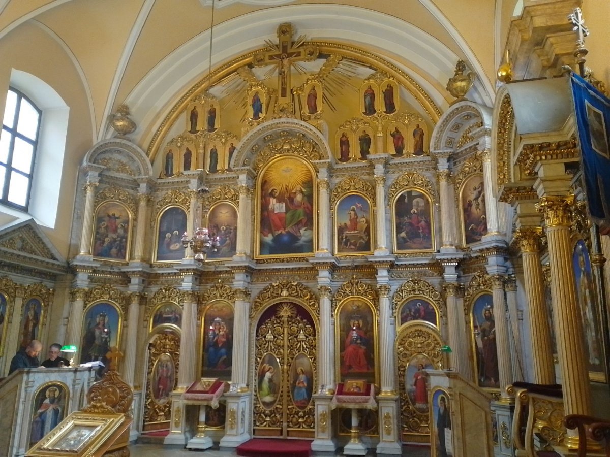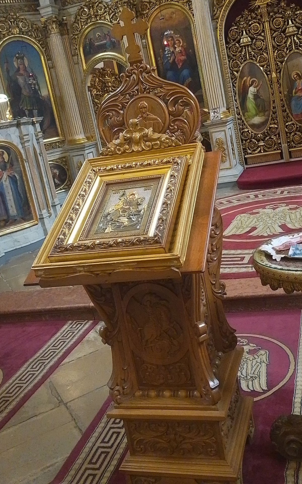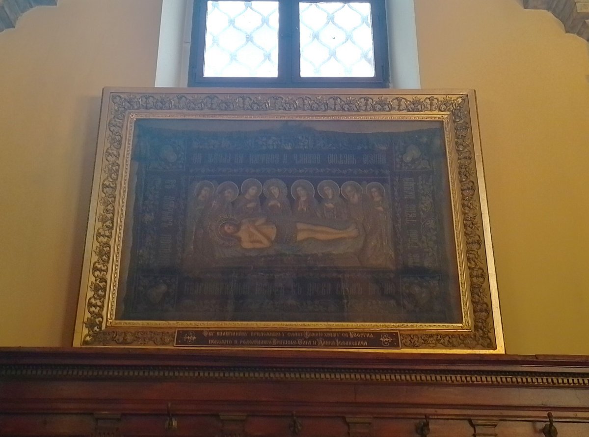 Az ikonosztáz két szinten sorakozó szentképei azért kárpótolják a híveket: alul az Istenszülő Szűzanya, Jézus Krisztus, Szent György, Keresztelő Szent János, Szent Mihály arkangyal és Szent István első vértanú látható, a királykapu két szárnyára pedig az Angyali üdvözlet jelenete került baloldalt Gábriel arkangyallal, jobboldalt pedig Máriával. A felső sor középső nagy képe a Szentháromságot ábrázolja az Atyával, a jobbján ülő Fiúval és fölöttük a Szentlélek galambjával. Ezt két oldalról Jézus életének jelenetei fogják körül: születése, színeváltozása, bevonulása Jeruzsálembe, feltámadása, mennybemenetele, illetve a Szentlélek kiáradása.