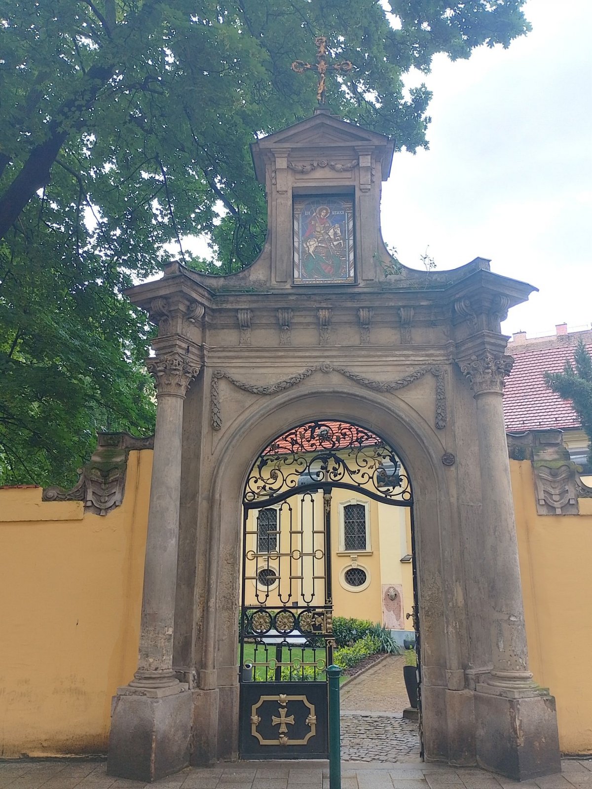 A gazdagon díszített templomot egy tekintélyt parancsoló fal védi, melyen mindkét utca felől nyitottak kaput. A Szerb utcai a szebb, melyet 1776-ban készítettek copf stílusban: a félkörívesen záródó nyílást két oldalról korinthoszi fejezetű oszlopok, felül pedig füzérek határolják. Az erősen kiülő főpárkányra egy kőkeretet állítottak, melyben Szent Györgyöt ábrázoló színes ólomüveg betét kapott helyet. Az utcák találkozásánál szintén kiemelkedik a falból egy fülke, benne a titulusszent kerámialapokból összeállított képével. A Veres Pálné utcára egy kocsikapu és egy gyalogos kapu is nyílik, mindkettő fekete kovácsoltvas, aranyszínű díszekkel. A fal kert felőli oldalába egyébként a hívek sírköveit építették be.